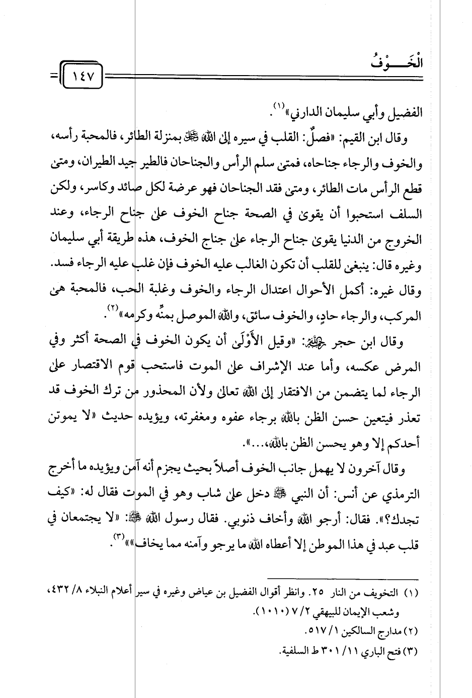 وقال ابن القيم: "فصلٌ: القلب في سيره إلى الله عزَّ وجلَّ بمنزلة الطائر، فالمحبة رأسه، والخوف والرجاء جناحاه، فمتى سلم الرأس والجناحان فالطير جيد الطيران، ومتى قطع الرأس مات الطائر، ومتى فقد الجناحان فهو عرضة لكل صائد وكاسر، ولكن السلف استحبوا أن يقوى في الصحة جناح الخوف على جناح الرجاء، وعند الخروج من الدنيا يقوى جناح الرجاء على جناح الخوف، هذه طريقة أبي سليمان وغيره قال: ينبغى للقلب أن تكون الغالب عليه الخوف فإن غلب عليه الرجاء فسد. وقال غيره: أكمل الأحوال اعتدال الرجاء والخوف وغلبة الحب، فالمحبة هي المركب، والرجاء حادٍ، والخوف سائق، والله الموصل بمنِّه وكرمه" (¬٢).