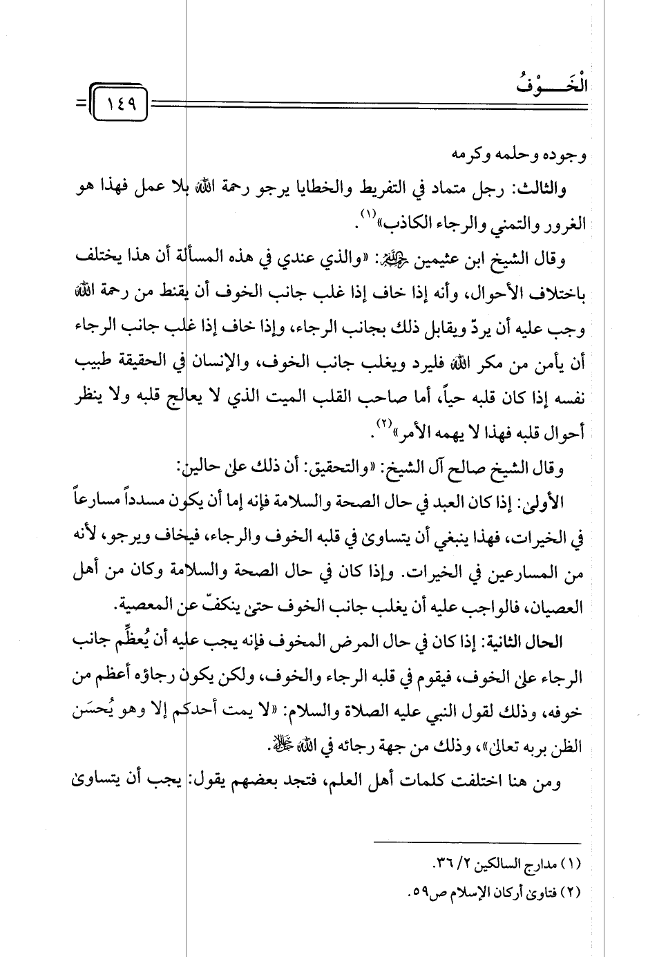 وقال الشيخ ابن عثيمين رَحِمَه الله: "والذي عندي في هذه المسألة أن هذا يختلف باختلاف الأحوال، وأنه إذا خاف إذا غلب جانب الخوف أن يقنط من رحمة الله وجب عليه أن يردّ ويقابل ذلك بجانب الرجاء، وإذا خاف إذا غلب جانب الرجاء أن يأمن من مكر الله فليرد ويغلب جانب الخوف، والإنسان في الحقيقة طبيب نفسه إذا كان قلبه حيًا، أما صاحب القلب الميت الذي لا يعالج قلبه ولا ينظر أحوال قلبه فهذا لا يهمه الأمر" (¬٢).