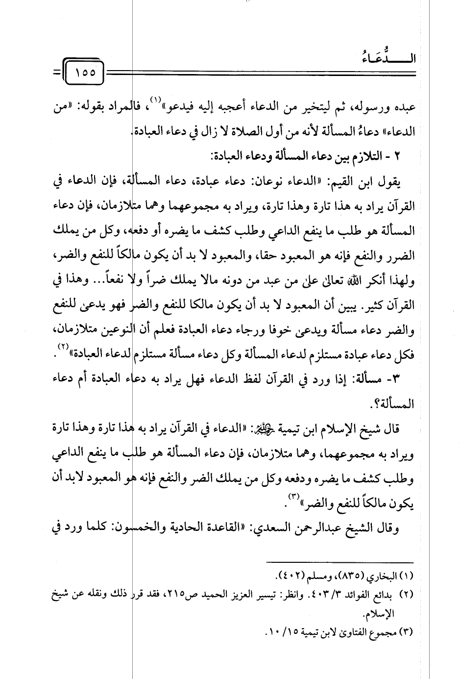 قال شيخ الإسلام ابن تيمية رَحِمَه الله: "الدعاء في القرآن يراد به هذا تارة وهذا تارة ويراد به مجموعهما، وهما متلازمان، فإن دعاء المسألة هو طلب ما ينفع الداعي وطلب كشف ما يضره ودفعه وكل من يملك الضر والنفع فإنه هو المعبود لابد أن يكون مالكًا للنفع والضر" (¬٣).