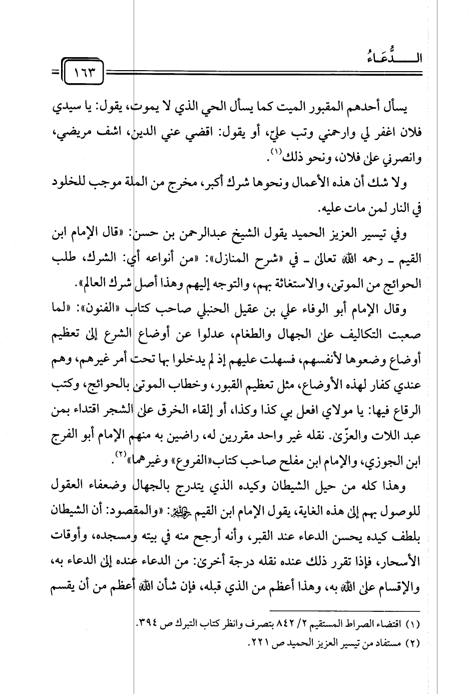 وفي تيسير العزيز الحميد يقول الشيخ عبد الرحمن بن حسن: "قال الإمام ابن القيم - رحمه الله تعالى - في "شرح المنازل": "من أنواعه أي: الشرك، طلب الحوائج من الموتى، والاستغاثة بهم، والتوجه إليهم وهذا أصل شرك العالم".