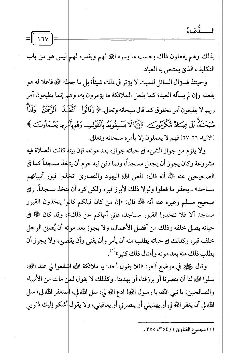 وقال رَحِمَه الله في موضع آخر: "فلا يقول أحد: يا ملائكة الله اشفعوا لي عند الله، سلوا الله لنا أن ينصرنا أو يرزقنا، أو يهدينا. وكذلك لا يقول لمن مات من الأنبياء والصالحين: يا نبي الله، يا رسول الله! ادع الله لي، سل الله لي، استغفر الله لي، سل الله لي أن يغفر الله لي أو يهديني أو ينصرني أو يعافيني، ولا يقول أشكو إليك ذنوبي