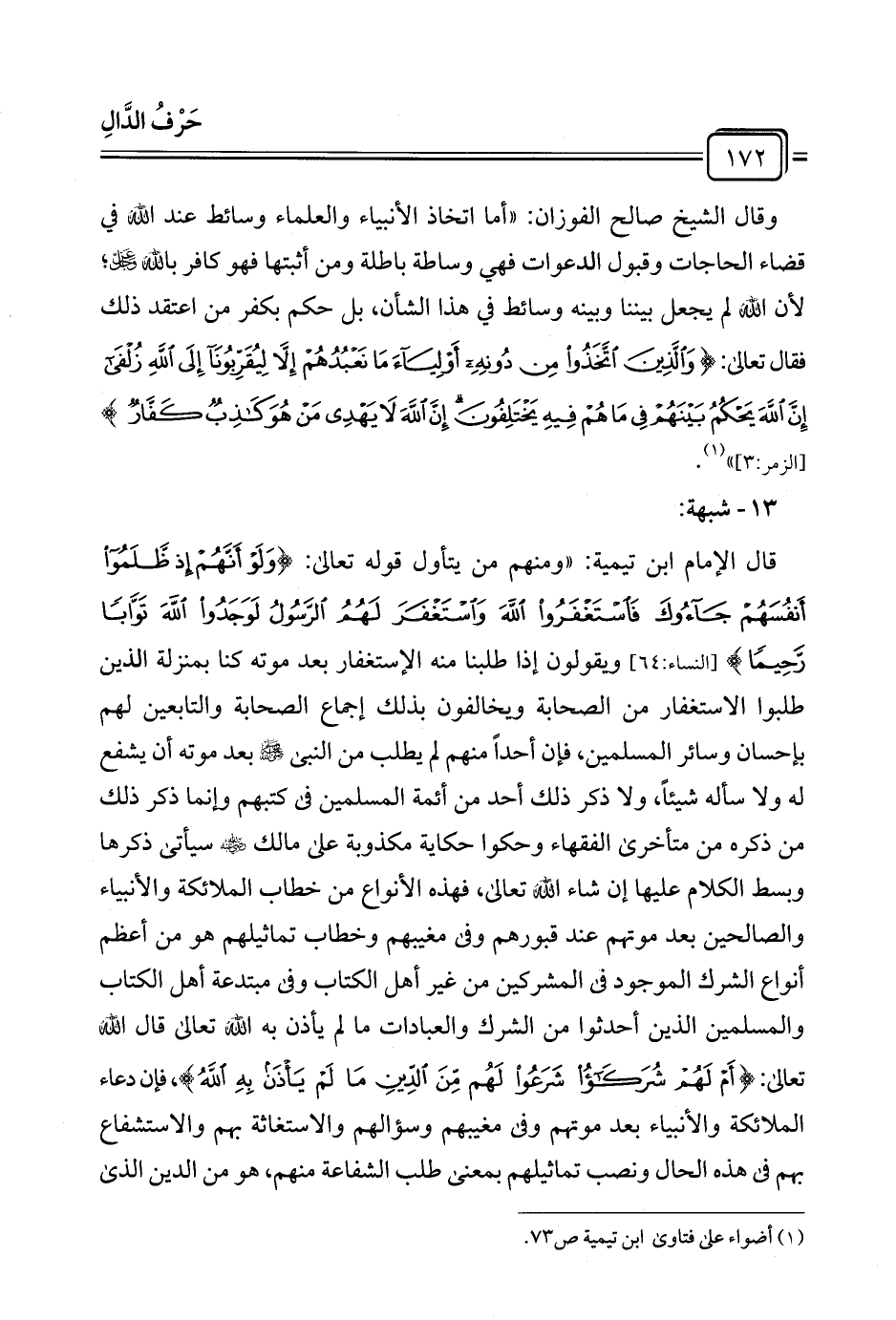 وقال الشيخ صالح الفوزان: "أما اتخاذ الأنبياء والعلماء وسائط عند الله في قضاء الحاجات وقبول الدعوات فهي وساطة باطلة ومن أثبتها فهو كافر بالله عزَّ وجلَّ؛ لأن الله لم يجعل بيننا وبينه وسائط في هذا الشأن، بل حكم بكفر من اعتقد ذلك فقال تعالى: {وَالَّذِينَ اتَّخَذُوا مِنْ دُونِهِ أَوْلِيَاءَ مَا نَعْبُدُهُمْ إِلَّا لِيُقَرِّبُونَا إِلَى اللَّهِ زُلْفَى إِنَّ اللَّهَ يَحْكُمُ بَيْنَهُمْ فِي مَا هُمْ فِيهِ يَخْتَلِفُونَ إِنَّ اللَّهَ لَا يَهْدِي مَنْ هُوَ كَاذِبٌ كَفَّارٌ} [الزمر: ٣] (¬١).