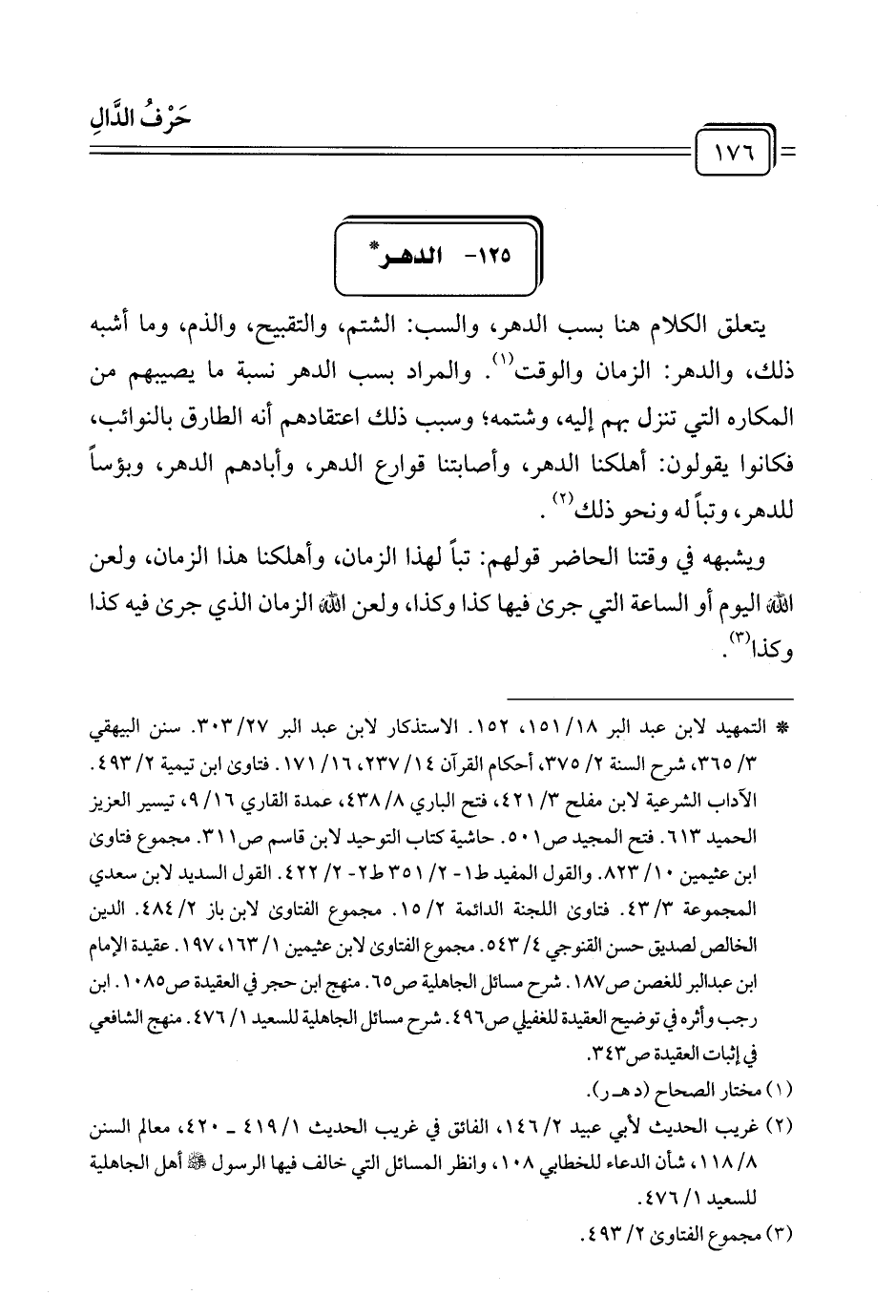 يتعلق الكلام هنا بسب الدهر، والسب: الشتم، والتقبيح، والذم، وما أشبه ذلك، والدهر: الزمان والوقت (¬١). والمراد بسب الدهر نسبة ما يصيبهم من المكاره التي تنزل بهم إليه، وشتمه؛ وسبب ذلك اعتقادهم أنه الطارق بالنوائب، فكانوا يقولون: أهلكنا الدهر، وأصابتنا قوارع الدهر، وأبادهم الدهر، وبؤسًا للدهر، وتبًا له ونحو ذلك (¬٢).