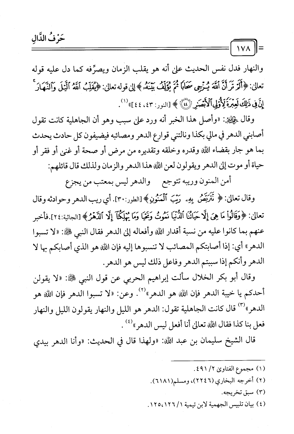 وقال تعالى: {نَتَرَبَّصُ بِهِ رَيْبَ الْمَنُونِ} [الطور:٣٠]. أي ريب الدهر وحوادثه وقال تعالى: {وَقَالُوا مَا هِيَ إِلَّا حَيَاتُنَا الدُّنْيَا نَمُوتُ وَنَحْيَا وَمَا يُهْلِكُنَا إِلَّا الدَّهْرُ} [الجاثية:٢٤]. فأخبر عنهم بما كانوا عليه من نسبة أقدار الله وأفعاله إلى الدهر فقال النبي - صلى الله عليه وسلم -: "لا تسبوا الدهر" أي: إذا أصابتكم المصائب لا تنسبوها إليه فإن الله هو الذي أصابكم بها لا الدهر وأنكم إذا سببتم الدهر وفاعل ذلك ليس هو الدهر.