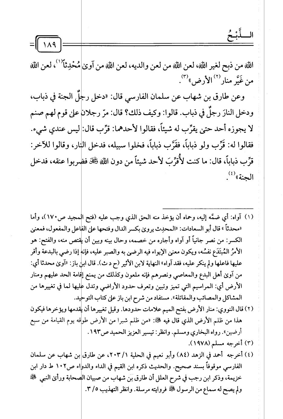 وعن طارق بن شهاب عن سلمان الفارسي قال: "دخل رجلٌ الجنة في ذباب، ودخل النارَ رجلٌ في ذباب. قالوا: وكيف ذلك؟ قال: مرّ رجلان على قوم لهم صنم لا يجوزه أحد حتى يقرِّب له شيئًا، فقالوا لأحدهما: قرِّب قال: ليس عندي شيء. فقالوا له: قَرِّب ولو ذبابًا، فقَرَّب ذبابًا، فخلوا سبيله، فدخل النار، وقالوا للآخر: قرِّب ذبابًا، قال: ما كنت لأُقرِّبَ لأحد شيئًا من دون الله عزَّ وجلَّ فضربوا عنقه، فدخل الجنة" (¬٤).