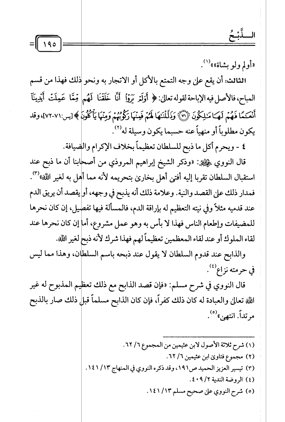 قال النووي - رحمه الله -: "وذكر الشيخ إبراهيم المروذي من أصحابنا أن ما ذبح عند استقبال السلطان تقربا إليه أفتى أهل بخارى بتحريمه لأنه مما أهل به لغير الله" (¬٣). فمدار ذلك على القصد والنية. وعلامة ذلك أنه يذبح في وجهه، أو يقصد أن يريق الدم عند قدميه مثلًا وفي نيته التعظيم له بإراقة الدم، فالمسألة فيها تفصيل، إن كان نحرها للمضيفات وإطعام الناس فهذا لا بأس به وهو عمل مشروع، أما إن كان نحرها عند لقاء الملوك أو عند لقاء المعظمين تعظيمًا لهم فهذا شرك لأنه ذبح لغير الله.