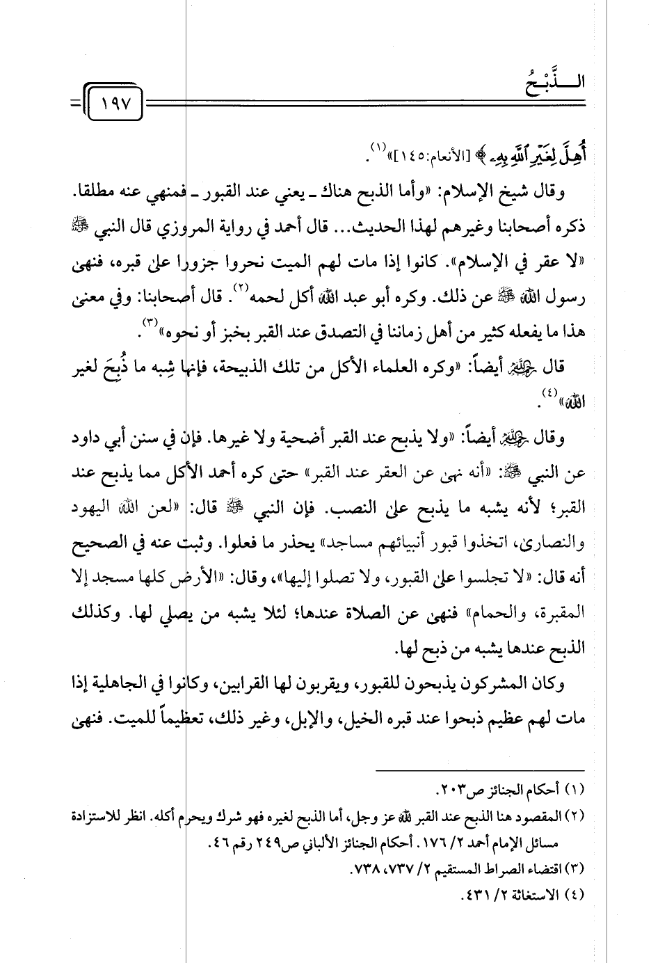 وقال - رحمه الله - أيضًا: "ولا يذبح عند القبر أضحية ولا غيرها. فإن في سنن أبي داود عن النبي - صلى الله عليه وسلم -: "أنه نهى عن العقر عند القبر" حتى كره أحمد الأكل مما يذبح عند القبر؛ لأنه يشبه ما يذبح على النصب. فإن النبي - صلى الله عليه وسلم - قال: "لعن الله اليهود والنصارى، اتخذوا قبور أنبيائهم مساجد" يحذر ما فعلوا. وثبت عنه في الصحيح أنه قال: "لا تجلسوا على القبور، ولا تصلوا إليها"، وقال: "الأرض كلها مسجد إلا المقبرة، والحمام" فنهى عن الصلاة عندها؛ لئلا يشبه من يصلي لها. وكذلك الذبح عندها يشبه من ذبح لها.