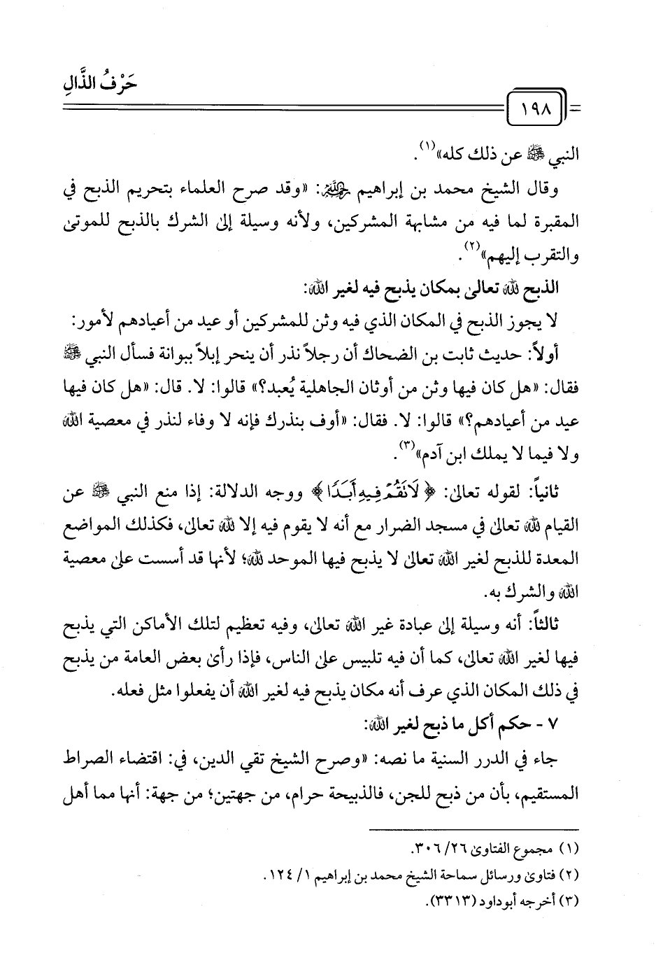 ثانيًا: لقوله تعالى: {لَا تَقُمْ فِيهِ أَبَدًا} ووجه الدلالة: إذا منع النبي - صلى الله عليه وسلم - عن القيام لله تعالى في مسجد الضرار مع أنه لا يقوم فيه إلا لله تعالى، فكذلك المواضع المعدة للذبح لغير الله تعالى لا يذبح فيها الموحد لله؛ لأنها قد أسست على معصية الله والشرك به.