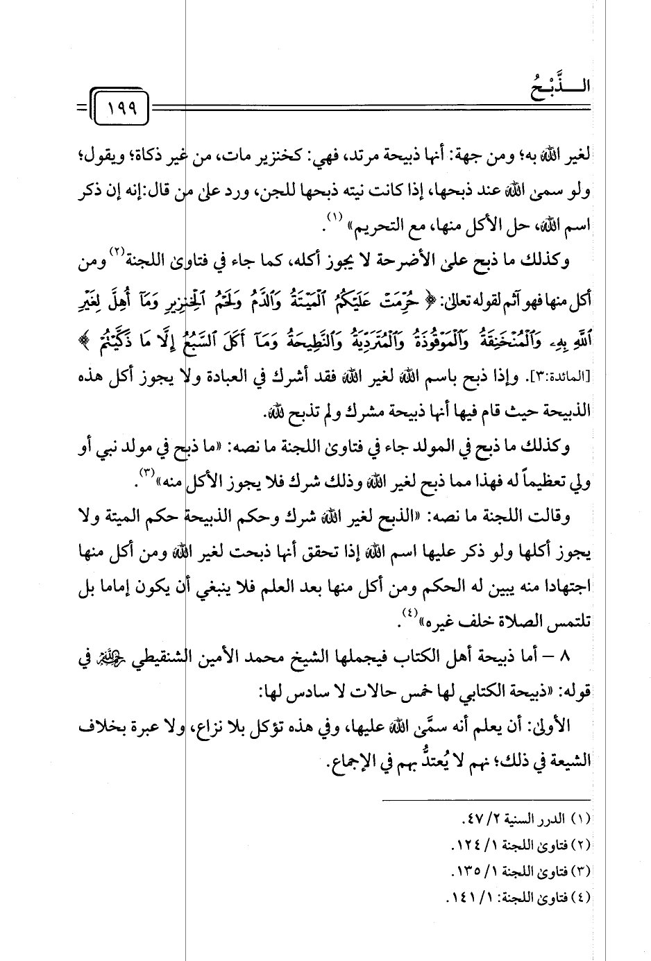 وقالت اللجنة ما نصه: "الذبح لغير الله شرك وحكم الذبيحة حكم الميتة ولا يجوز أكلها ولو ذكر عليها اسم الله إذا تحقق أنها ذبحت لغير الله ومن أكل منها اجتهادا منه يبين له الحكم ومن أكل منها بعد العلم فلا ينبغي أن يكون إماما بل تلتمس الصلاة خلف غيره" (¬٤).