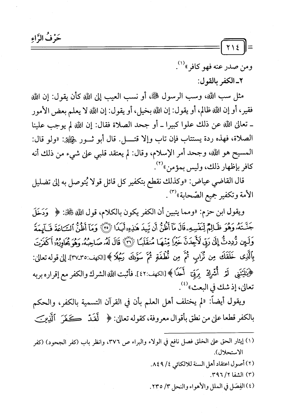 ويقول ابن حزم: "ومما يتبين أن الكفر يكون بالكلام، قول الله - عز وجل -: {وَدَخَلَ جَنَّتَهُ وَهُوَ ظَالِمٌ لِنَفْسِهِ قَالَ مَا أَظُنُّ أَنْ تَبِيدَ هَذِهِ أَبَدًا (٣٥) وَمَا أَظُنُّ السَّاعَةَ قَائِمَةً وَلَئِنْ رُدِدْتُ إِلَى رَبِّي لأَجِدَنَّ خَيْرًا مِنْهَا مُنْقَلَبًا (٣٦) قَالَ لَهُ صَاحِبُهُ وَهُوَ يُحَاوِرُهُ أَكَفَرْتَ بِالَّذِي خَلَقَكَ مِنْ تُرَابٍ ثُمَّ مِنْ نُطْفَةٍ ثُمَّ سَوَّاكَ رَجُلًا} [الكهف:٣٥ - ٣٧]. إلى قوله تعالى: {يَالَيْتَنِي لَمْ أُشْرِكْ بِرَبِّي أَحَدًا} [الكهف:٤٢]. فأثبت الله الشرك والكفر مع إقراره بربه تعالى، إذ شك في البعث" (¬٤).