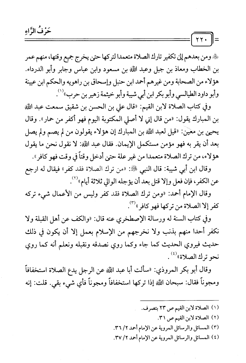 - رضي الله عنهم - ومن بعدهم إلى تكفير تارك الصلاة متعمدا لتركها حتى يخرج جميع وقتها، منهم عمر بن الخطاب ومعاذ بن جبل وعبد الله بن مسعود وابن عباس وجابر وأبو الدرداء. هؤلاء من الصحابة ومن غيرهم أحمد بن حنبل وإسحاق بن راهويه والحكم بن عيينة وأبو داود الطيالسي وأبو بكر بن أبي شيبة وأبو خيثمة زهير بن حرب" (¬١).