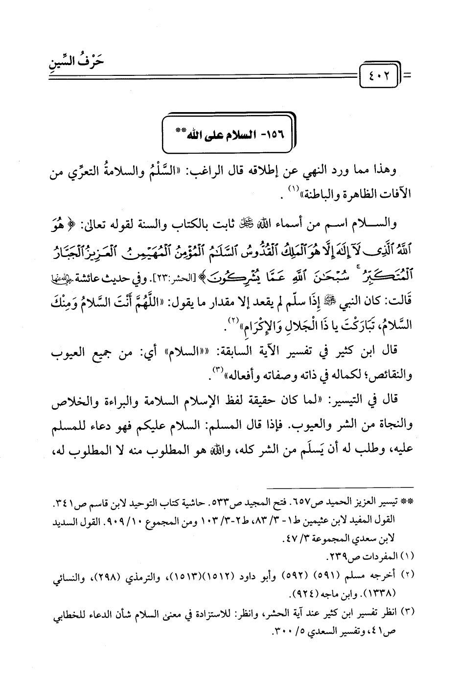 (¬٣) انظر تفسير ابن كثير عند آية الحشر، وانظر: للاستزادة في معنى السلام شأن الدعاء للخطابي ص ٤١، وتفسير السعدي ٥/ ٣٠٠.