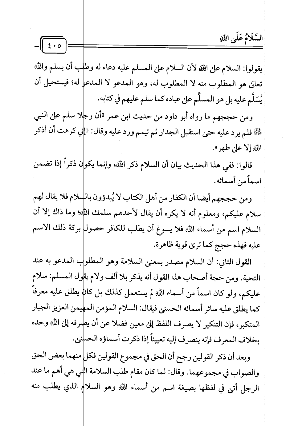 ومن حججهم أيضًا أن الكفار من أهل الكتاب لا يُبدؤون بالسلام فلا يقال لهم سلام عليكم، ومعلوم أنه لا يكره أن يقال لأحدهم سلمك الله؛ وما ذاك إلا أن السلام اسم من أسماء الله فلا يسوغ أن يطلب للكافر حصول بركة ذلك الاسم عليه فهذه حجج كما ترى قوية ظاهرة.