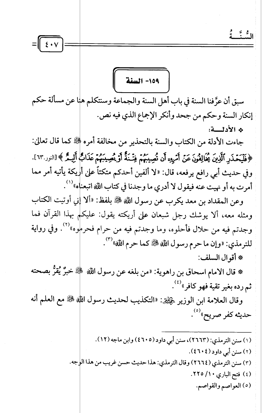 وعن المقداد بن معد يكرب عن رسول الله - صلى الله عليه وسلم - بلفظ: "ألا إني أوتيت الكتاب ومثله معه، ألا يوشك رجل شبعان على أريكته يقول: عليكم بهذا القرآن فما وجدتم فيه من حلال فأحلوه، وما وجدتم فيه من حرام فحرموه" (¬٢). وفي رواية للترمذي: "وإن ما حرم رسول الله - صلى الله عليه وسلم - كما حرم الله" (¬٣).