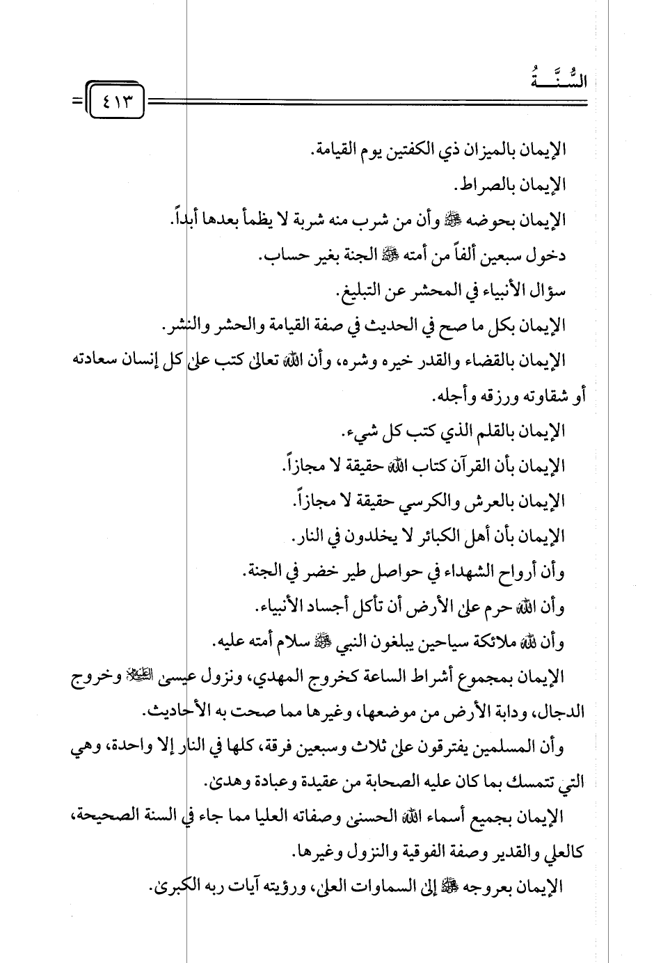 الإيمان بجميع أسماء الله الحسنى وصفاته العليا مما جاء في السنة الصحيحة، كالعلي والقدير وصفة الفوقية والنزول وغيرها.