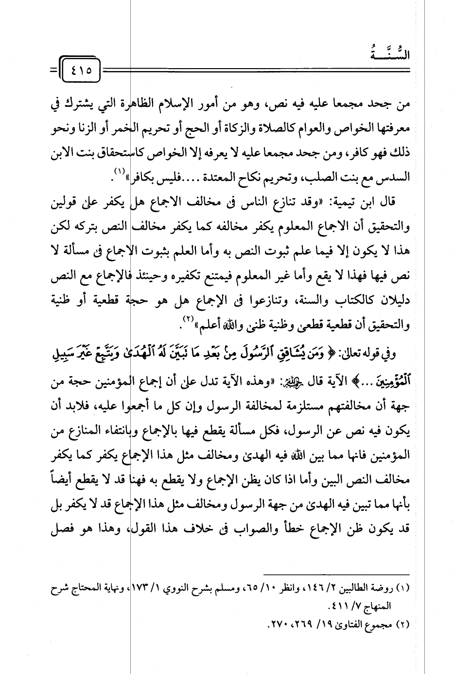 وفي قوله تعالى: {وَمَنْ يُشَاقِقِ الرَّسُولَ مِنْ بَعْدِ مَا تَبَيَّنَ لَهُ الْهُدَى وَيَتَّبِعْ غَيْرَ سَبِيلِ الْمُؤْمِنِينَ} الآية قال رحمه الله: "وهذه الآية تدل على أن إجماع المؤمنين حجة من جهة أن مخالفتهم مستلزمة لمخالفة الرسول وإن كل ما أجمعوا عليه، فلابد أن يكون فيه نص عن الرسول، فكل مسألة يقطع فيها بالإجماع وبانتفاء المنازع من المؤمنين فإنها مما بين الله فيه الهدى ومخالف مثل هذا الإجماع يكفر كما يكفر مخالف النص البين وأما إذا كان يظن الإجماع ولا يقطع به فهنا قد لا يقطع أيضًا بأنها مما تبين فيه الهدى من جهة الرسول ومخالف مثل هذا الإجماع قد لا يكفر بل قد يكون ظن الإجماع خطأ والصواب في خلاف هذا القول، وهذا هو فصل