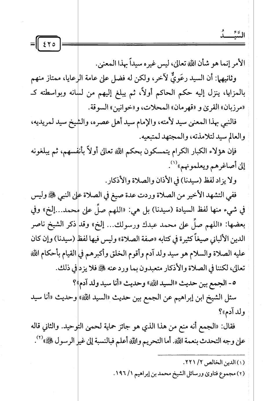 ففي التشهد الأخير من الصلاة وردت عدة صيغ في الصلاة علي النَّبِيّ - صلى الله عليه وسلم - وليس في شيء منها لفظ السيادة (سيدنا) بل هي: "اللهم صلِّ علي محمد ... إلخ" وفي بعضها: "اللهم صلِّ علي محمد عبدك ورسولك ... إلخ" وقد ذكر الشيخ ناصر الدين الألباني صيغًا كثيرة في كتابه "صفة الصلاة" وليس فيها لفظ (سيدنا) وإن كان عليه الصلاة والسلام هو سيد ولد آدم وأقوم الخلق وأكبرهم في المقام بأحكام الله تعالى، لكننا في الصلاة والأذكار متعبدون بما ورد عنه - صلى الله عليه وسلم - فلا يزد في ذلك