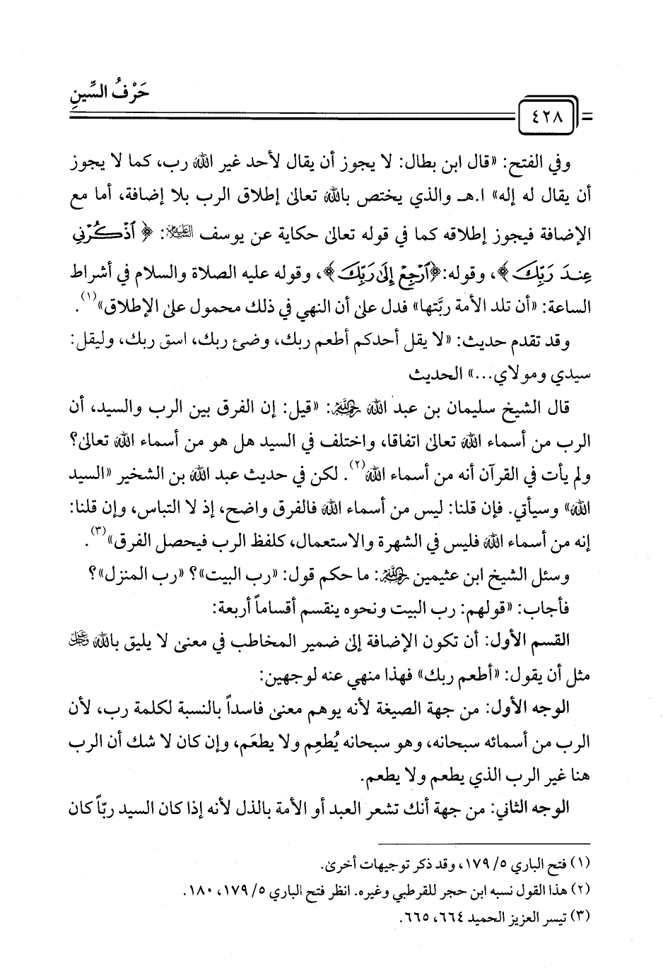 وفي الفتح: "قال ابن بطال: لا يجوز أن يقال لأحد غير الله رب، كما لا يجوز أن يقال له إله" ا. هـ والذي يختص بالله تعالى إطلاق الرب بلا إضافة، أما مع الإضافة فيجوز إطلاقه كما في قوله تعالى حكاية عن يوسف عليه السلام {اذْكُرْنِي عِنْدَ رَبِّكَ}، وقوله: ({ارْجِعْ إِلَى رَبِّكَ} وقوله عليه الصلاة والسلام في أشراط الساعة: "أن تلد الأمة ربَّتها" فدل علي أن النهي في ذلك محمول على الإطلاق" (¬١).