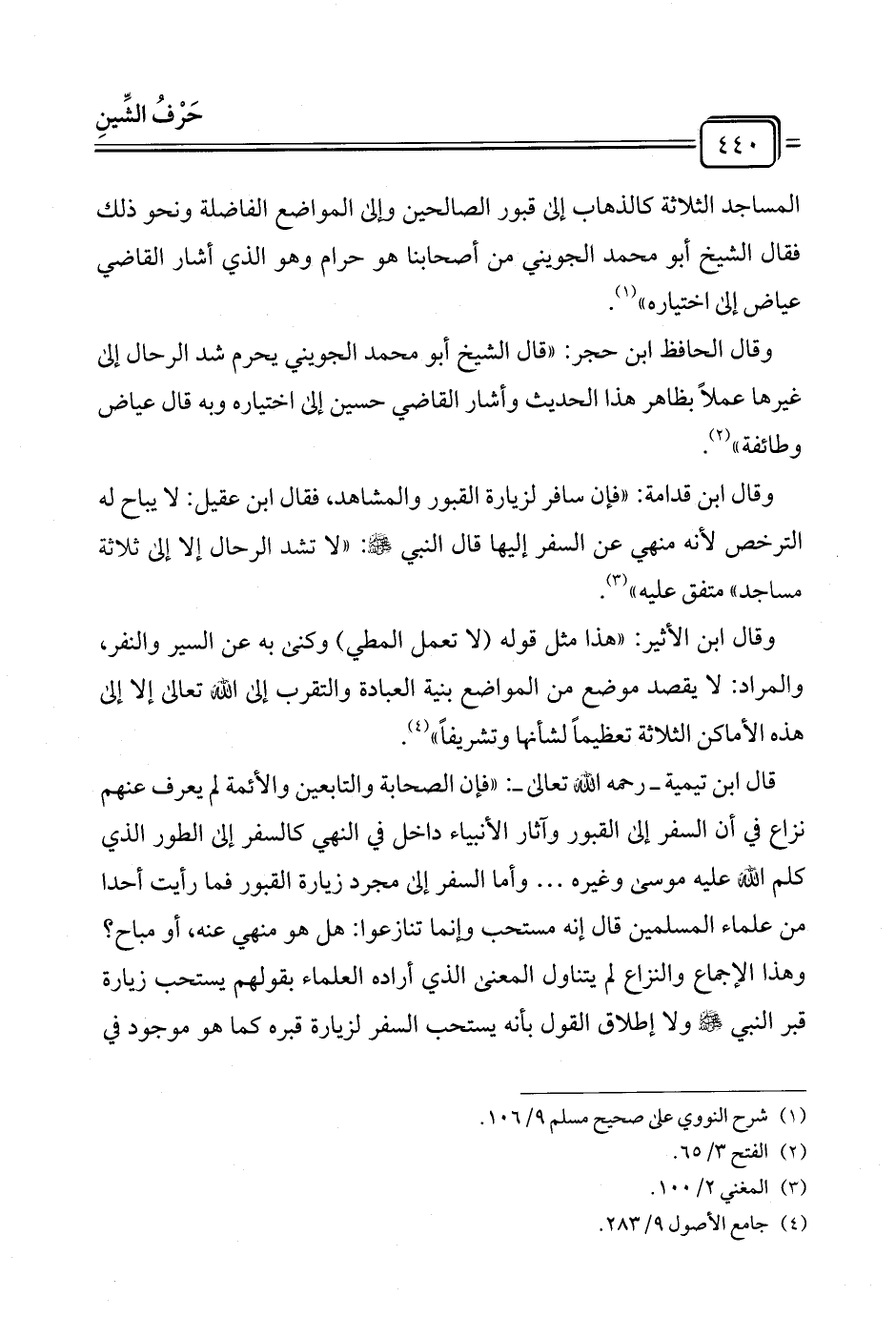 المساجد الثلاثة كالذهاب إلى قبور الصالحين وإلى المواضع الفاضلة ونحو ذلك فقال الشيخ أبو محمد الجويني من أصحابنا هو حرام وهو الذي أشار القاضي عياض إلى اختياره" (¬١).