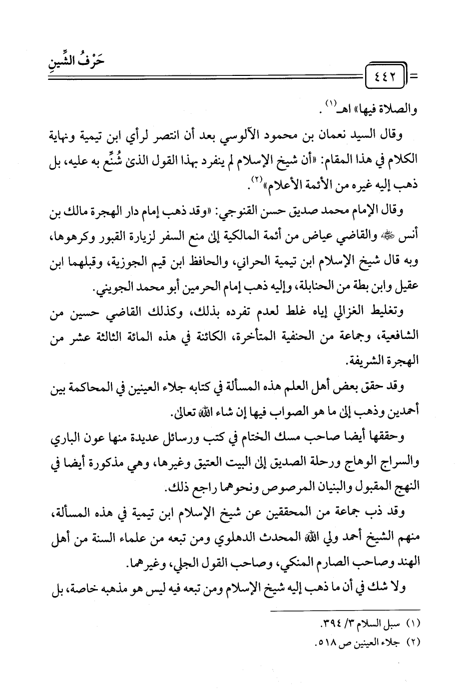 وقال الإمام محمد صديق حسن القنوجي: "وقد ذهب إمام دار الهجرة مالك بن أنس - رضي الله عنه - والقاضي عياض من أئمة المالكية إلى منع السفر لزيارة القبور وكرهوها، وبه قال شيخ الإسلام ابن تيمية الحراني، والحافظ ابن قيم الجوزية، وقبلهما ابن عقيل وابن بطة من الحنابلة، وإليه ذهب إمام الحرمين أبو محمد الجويني.
