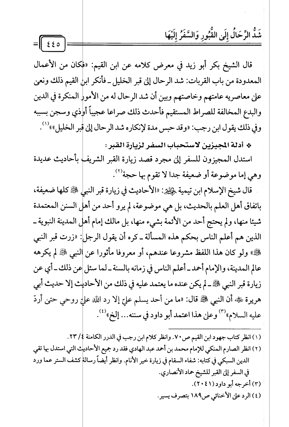 (¬٢) انظر الصارم المنكي للإمام محمد بن أحمد عبد الهادي فقد رد جميع الأحاديث التي استدل بها تقي الدين السبكي في كتابه: شفاء السقام في زيارة خير الأنام. وانظر أيضًا رسالة كشف الستر عما ورد في السفر إلى القبر للشيخ حماد الأنصاري.