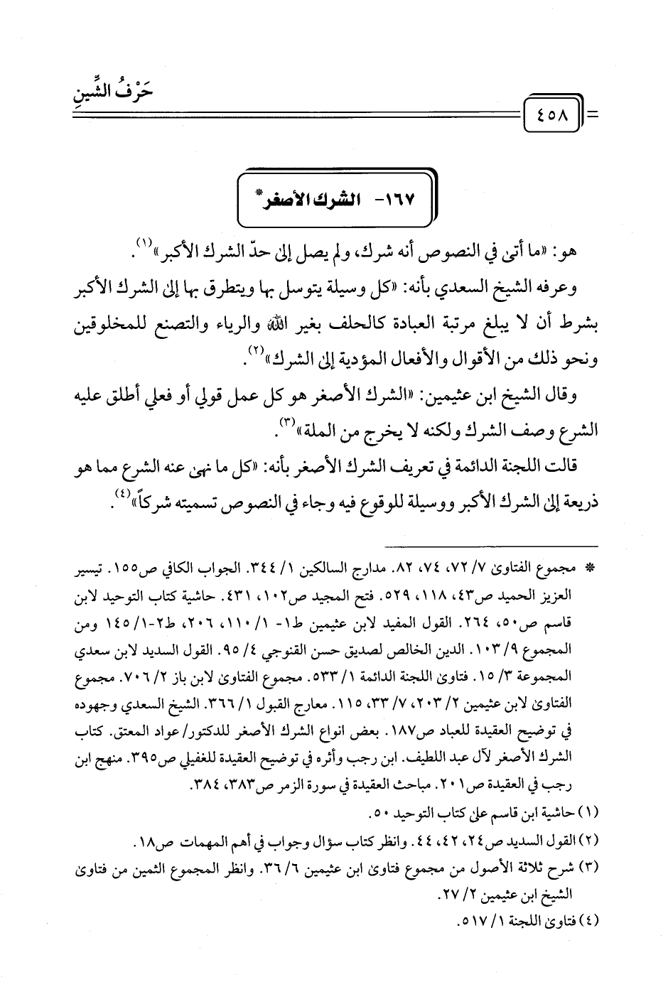 وقال الشيخ ابن عثيمين: "الشرك الأصغر هو كل عمل قولي أو فعلي أطلق عليه الشرع وصف الشرك ولكنه لا يخرج من الملة" (¬٣).