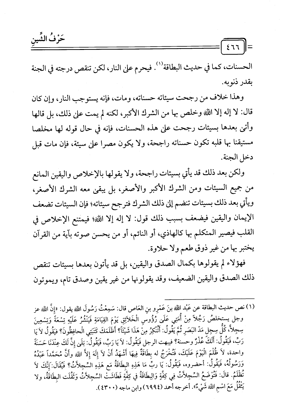 (¬١) نص حديث البطاقة عن عَبْد الله بنَ عَمْرِو بنِ العَاص قال: سَمِعْتُ رَسُولَ الله يقول: "إِنَّ الله عز وجل يستخلصُ رَجُلًا مِنْ أُمَّتِي عَلَى رُؤُوسِ الْخَلَائِقِ يَوْمَ القِيَامَةِ فَيَنْشُرُ عَلَيْهِ تِسْعَةً وَتِسْعِينَ سِجِلًّا، كُلُّ سِجِلٍ مَدّ البَصَرِ ثُمَّ يَقُولُ: أتنْكِرُ مِنْ هَذَا شَيْئًا؟ أَظَلَمَكَ كَتبَتِي الْحافِظُونَ؟ فيقُولُ لَا يَا رَبِّ، فَيَقُولُ: أَلك عُذْرٌ وحسنة؟ فيبهت الرجل فَيَقُولُ: لَا يَا رَبِّ، فَيَقُولُ: بَلَى إِنَّ لَكَ عِنْدَنَا حَسَنَةً واحدة، لَا ظُلْمَ الْيَوْمَ عَلَيْكَ، فَتُخْرَجُ له بطَاقَةٌ فِيهَا أَشْهَدُ أَنْ لَا إِلَهَ إِلَّا الله وأَنَّ مُحَمَّدًا عَبْدُهُ وَرَسُولُه، فَيَقُولُ: أحضروه، فَيَقُولُ: يَا ربِّ مَا هَذِهِ البطَاقَةُ مَع هَذِهِ السِّجِلَّاتُ؟ فَيُقَالَ: إِنَّكَ لَا تُظْلَمُ. قالَ: فَتُوْضَعُ السِّجِلَّاتُ فِي كِفَّةٍ وَالِبطَاقَةُ في كِفَّةٍ فَطَاشَتْ السِّجِلَّاتُ وَثَقُلَت البِطَاقَة، ولا يَثْقُلُ مَعَ اسْمِ الله شَيْءٌ". أخرجه أحمد (٦٩٩٤) وابن ماجه (٤٣٠٠).