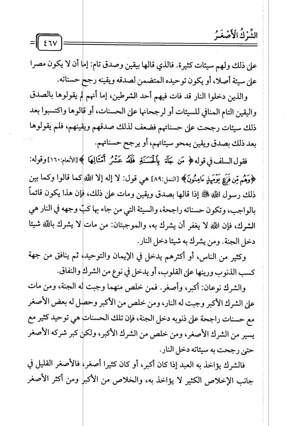 والشرك نوعان: أكبر، وأصغر. فمن خلص منهما وجبت له الجنة، ومن مات على الشرك الأكبر وجبت له النار، ومن خلص من الأكبر وحصل له بعض الأصغر مع حسنات راجحة علي ذنوبه دخل الجنة، فإن تلك الحسنات هي توحيد كثير مع يسير من الشرك الأصغر، ومن خلص من الشرك الأكبر، ولكن كبر شركه الأصغر حتى رجحت به سيئاته دخل النار.