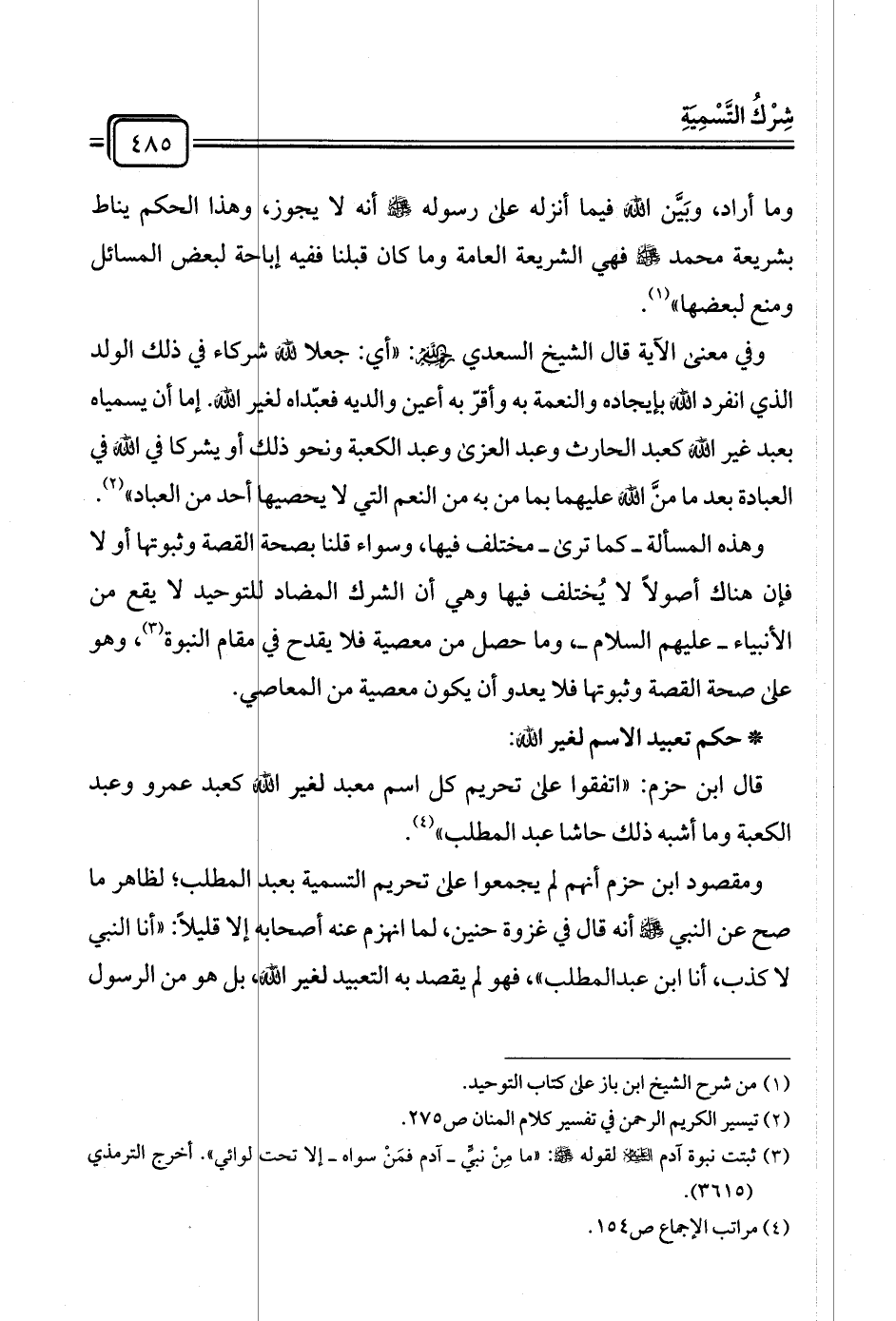 قال ابن حزم: "اتفقوا علي تحريم كل اسم معبد لغير الله كعبد عمرو وعبد الكعبة وما أشبه ذلك حاشا عبد المطلب" (¬٤).