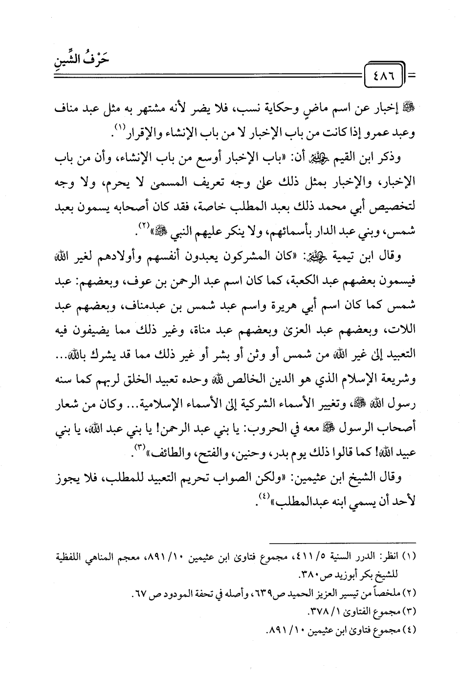 وقال الشيخ ابن عثيمين: "ولكن الصواب تحريم التعبيد للمطلب، فلا يجوز لأحد أن يسمي ابنه عبد المطلب" (¬٤).