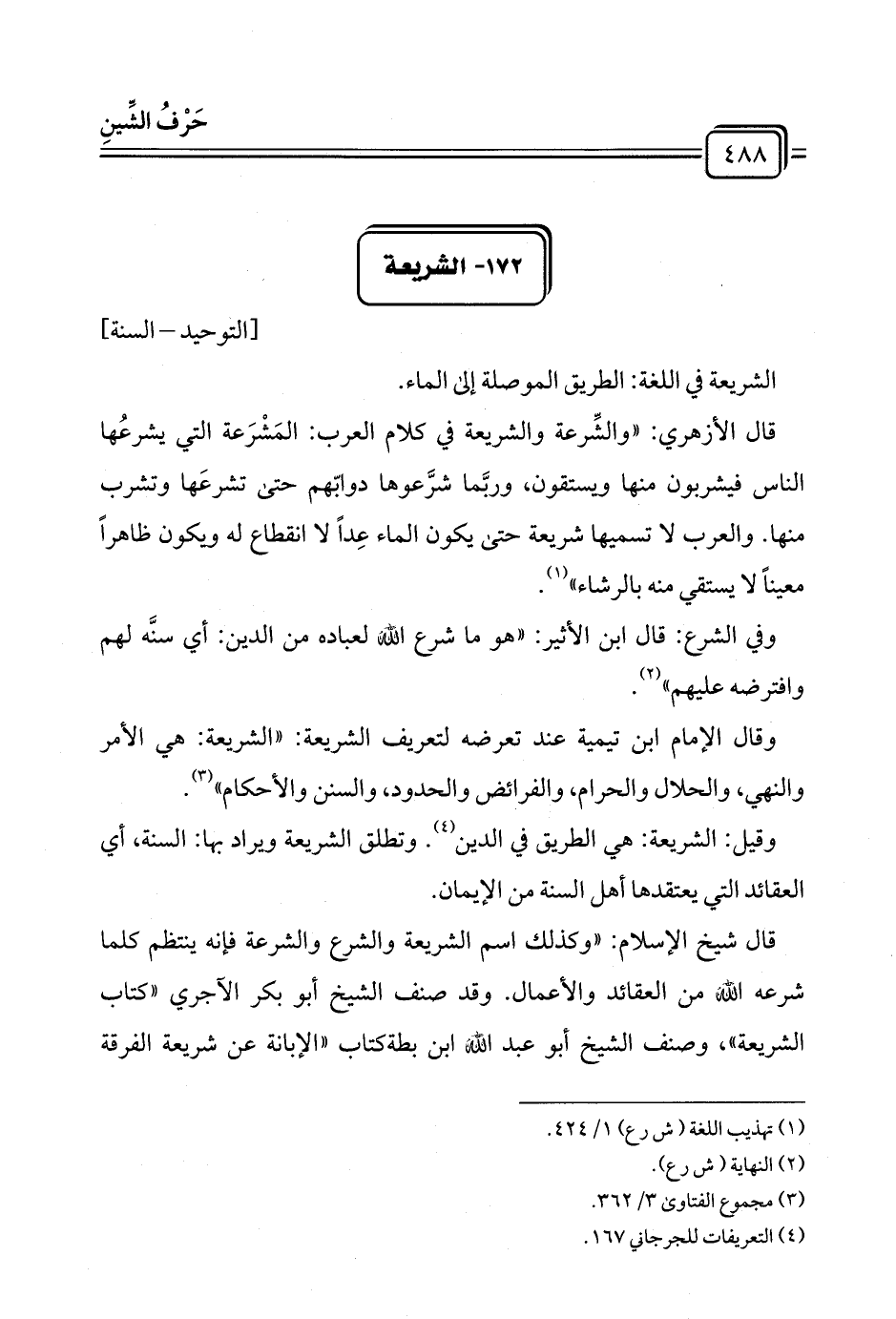 وقيل: الشريعة: هي الطريق في الدين (¬٤). وتطلق الشريعة ويراد بها: السنة؛ أي العقائد التي يعتقدها أهل السنة من الإيمان.