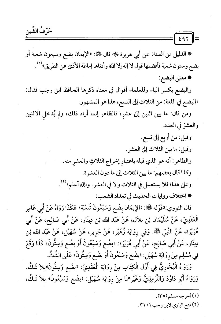 قال النووي: "قَوْله - صلى الله عليه وسلم - "الإِيمَان بِضْع وَسَبْعُونَ شعْبَة" هَكَذَا رَوَاهُ عَنْ أَبِي عَامِر الْعَقَدِيّ، عَنْ سُلَيْمَان بْن بلال، عَنْ عَبْد الله بْن دِينَار، عَنْ أَبي صَالِح، عَنْ أَبي هُرَيْرَة، عَنْ النَّبيّ - صلى الله عليه وسلم -. وَفِي رِوَايَة زُهيْر، عَنْ جَرِير، عَنْ سُهَيْل، عَنْ عَبْد الله بْن دِينَار، عَنْ أَبي صَالِح، عَنْ أَبي هُرَيْرَة: "بضْع وَسَبْعُونَ أَوْ بضْع وَسِتُّونَ" كَذَا وَقَعَ فِي مُسْلِم مِنْ رِوَايَة سُهَيْل: "بضْع وَسَبْعُونَ أَوْ بضْع وَسِتُّونَ" عَلَى الشَّكِّ.