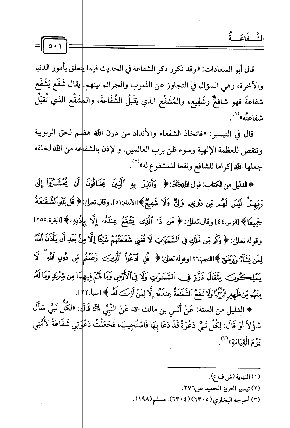 * الدليل من الكتاب: قول الله عَز وجل: {وَأَنْذِرْ بِهِ الَّذِينَ يَخَافُونَ أَنْ يُحْشَرُوا إِلَى رَبِّهِمْ لَيْسَ لَهُمْ مِنْ دُونِهِ وَلِيٌّ وَلَا شَفِيعٌ} [الأنعام: ٥١]، وقال تعالى: {قُلْ لِلَّهِ الشَّفَاعَةُ جَمِيعًا} [الزمر: ٤٤] وقال تعالى: {مَنْ ذَا الَّذِي يَشْفَعُ عِنْدَهُ إِلَّا بِإِذْنِهِ} [البقرة: ٢٥٥] وقوله تعالى: {وَكَمْ مِنْ مَلَكٍ فِي السَّمَاوَاتِ لَا تُغْنِي شَفَاعَتُهُمْ شَيْئًا إِلَّا مِنْ بَعْدِ أَنْ يَأْذَنَ اللَّهُ لِمَنْ يَشَاءُ وَيَرْضَى} [النجم: ٢٦] وقوله تعالى: {قُلِ ادْعُوا الَّذِينَ زَعَمْتُمْ مِنْ دُونِ اللَّهِ لَا يَمْلِكُونَ مِثْقَالَ ذَرَّةٍ فِي السَّمَاوَاتِ وَلَا فِي الْأَرْضِ وَمَا لَهُمْ فِيهِمَا مِنْ شِرْكٍ وَمَا لَهُ مِنْهُمْ مِنْ ظَهِيرٍ (٢٢) وَلَا تَنْفَعُ الشَّفَاعَةُ عِنْدَهُ إِلَّا لِمَنْ أَذِنَ لَهُ} [سبأ: ٢٢، ٢٣].