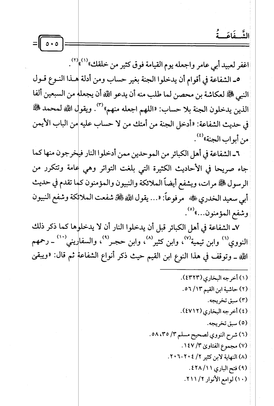 ٦ - الشفاعة في أهل الكبائر من الموحدين ممن أدخلوا النار فيخرجون منها كما جاء صريحا في الأحاديث الكثيرة التي بلغت التواتر وهي عامة وتتكرر من الرسول - صلى الله عليه وسلم - مرات، ويشفع أيضًا الملائكة والنبيون والمؤمنون تقدم في حديث أبي سعيد الخدري - رضي الله عنه - مرفوعًا: " ... يقول الله شفعت الملائكة وشفع النبيون وشفع المؤمنون ... " (¬٥).
