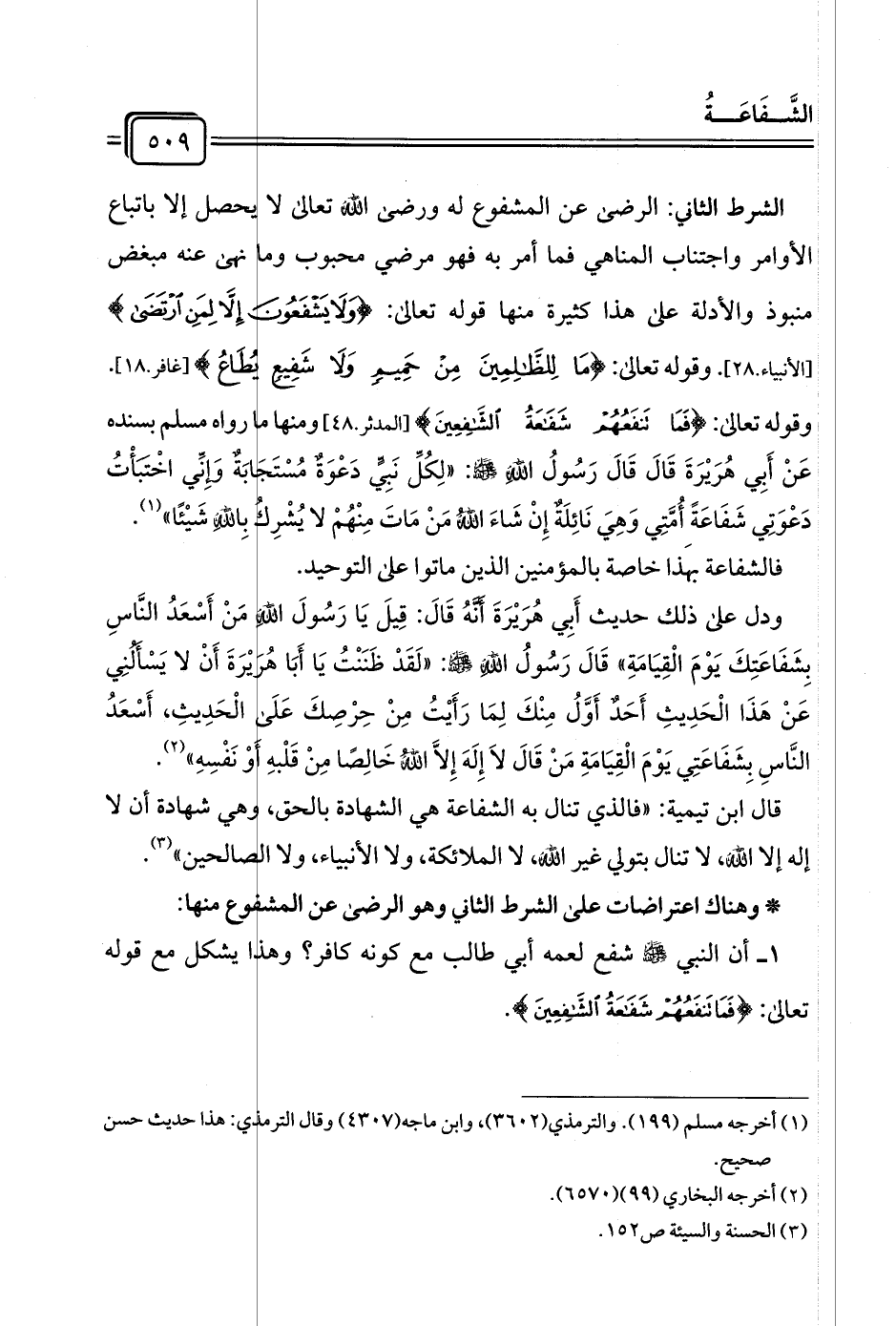 الشرط الثاني: الرضى عن المشفوع له ورضى الله تعالى لا يحصل إلا باتباع الأوامر واجتناب المناهي فما أمر به فهو مرضي محبوب وما نهى عنه مبغض منبوذ والأدلة على هذا كثيرة منها قوله تعالى: {وَلَا يَشْفَعُونَ إِلَّا لِمَنِ ارْتَضَى} [الأنبياء: ٢٨]. وقوله تعالى: {مَا لِلظَّالِمِينَ مِنْ حَمِيمٍ وَلَا شَفِيعٍ يُطَاعُ} [غافر: ١٨]. وقوله تعالى: {فَمَا تَنْفَعُهُمْ شَفَاعَةُ الشَّافِعِينَ} [المدثر: ٤٨] ومنها ما رواه مسلم بسنده عَنْ أَبِي هُرَيْرَةَ قَالَ قَالَ رَسُولُ الله - صلى الله عليه وسلم -: "لِكُلِّ نَبِيٍّ دَعْوَةٌ مُسْتَجَابَةٌ وَإِنِّي اخْتبَأْتُ دَعْوَتِي شَفَاعَةً أُمَّتِي وَهِيَ نَائِلَةٌ إِنْ شَاءَ الله مَنْ مَاتَ مِنْهُمْ لا يُشْرِكُ بِالله شَيْئًا" (¬١).