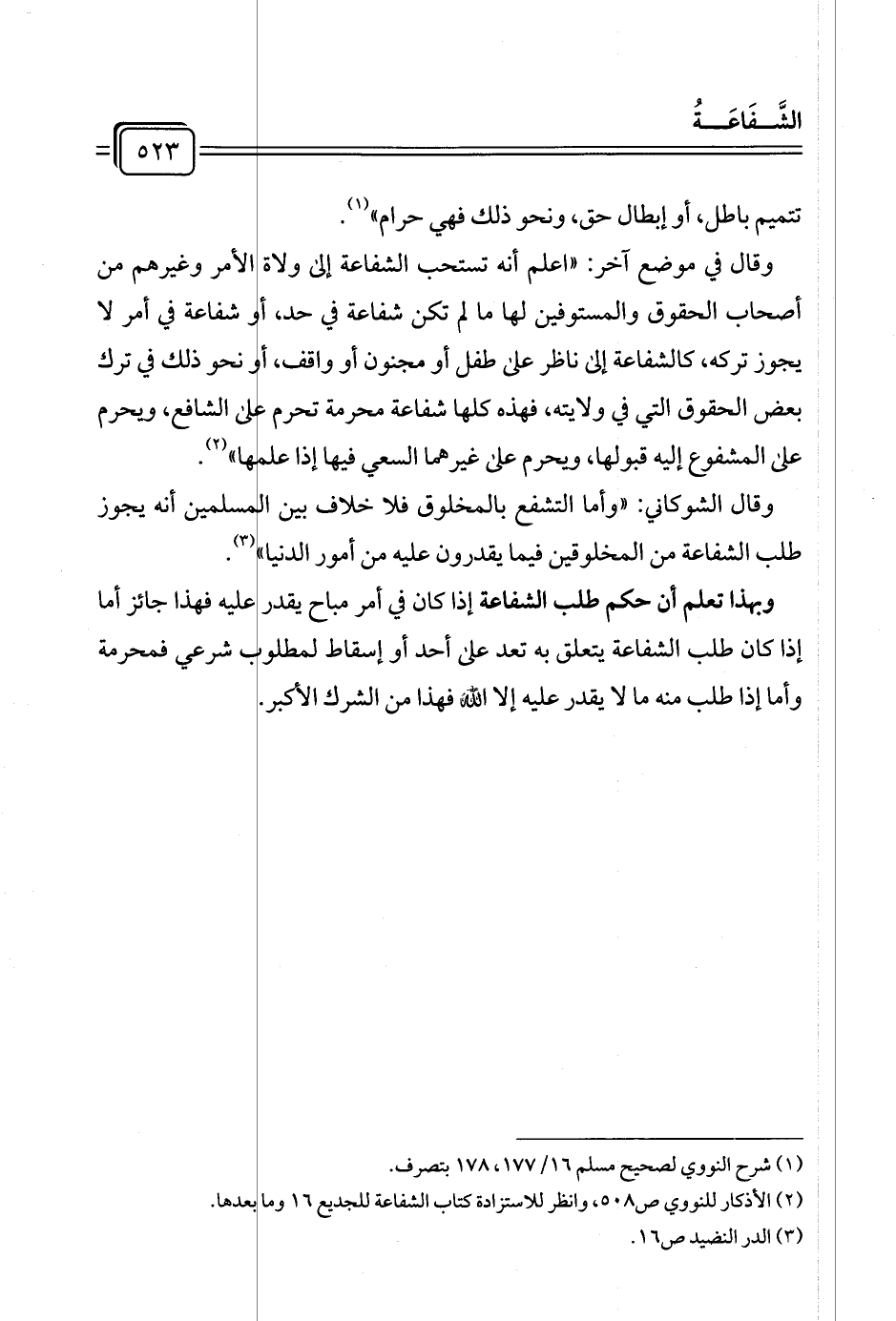 وقال في موضع آخر: "اعلم أنه تستحب الشفاعة إلى ولاة الأمر وغيرهم من أصحاب الحقوق والمستوفين لها ما لم تكن شفاعة في حد، أو شفاعة في أمر لا يجوز تركه، كالشفاعة إلى ناظر على طفل أو مجنون أو واقف، أو نحو ذلك في ترك بعض الحقوق التي في ولايته، فهذه كلها شفاعة محرمة تحرم على الشافع، ويحرم على المشفوع إليه قبولها، ويحرم على غيرهما السعي فيها إذا علمها" (¬٢).