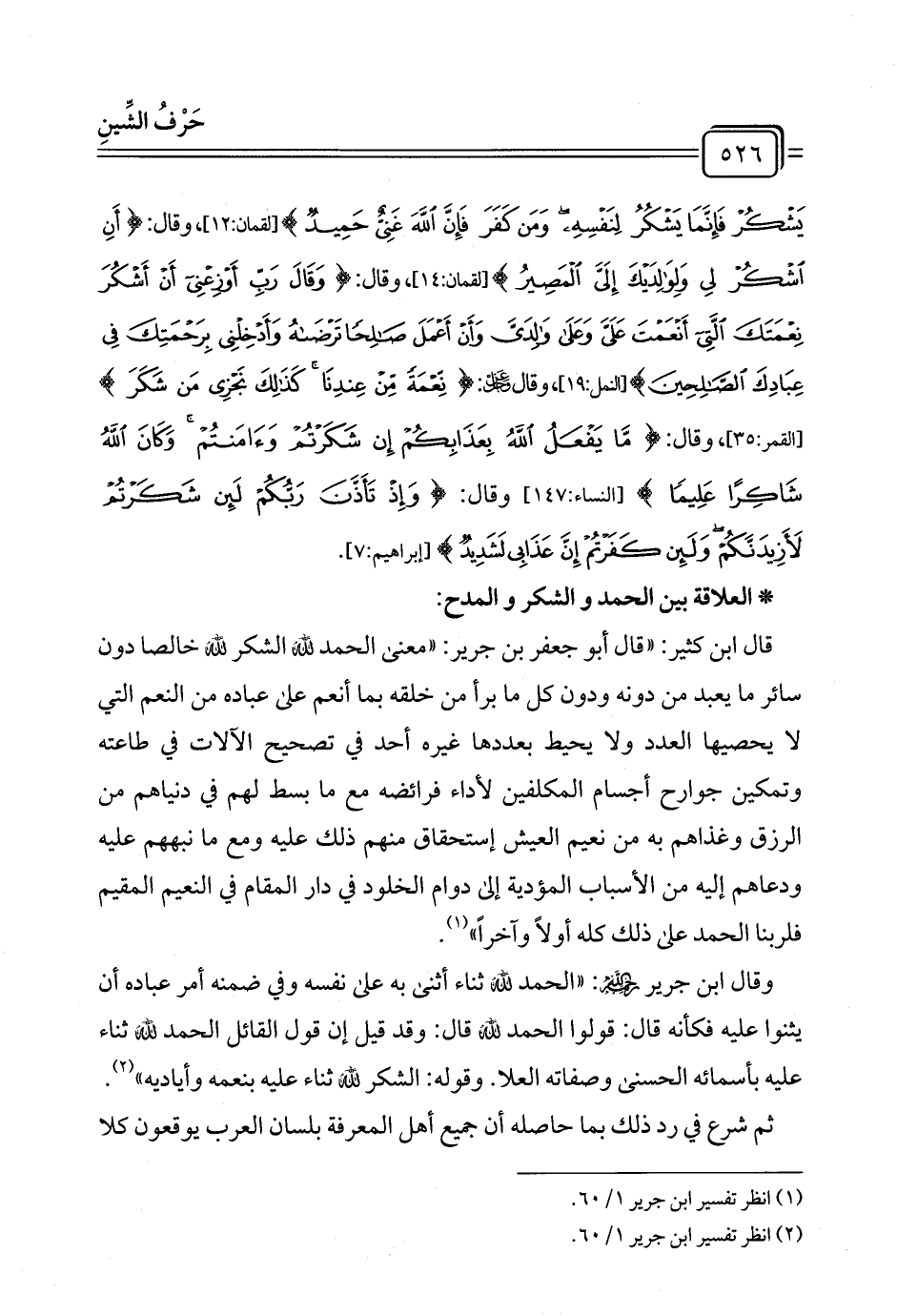 قال ابن كثير: "قال أبو جعفر بن جرير: "معنى الحمد لله الشكر لله خالصًا دون سائر ما يعبد من دونه ودون كل ما برأ من خلقه بما أنعم على عباده من النعم التي لا يحصيها العدد ولا يحيط بعددها غيره أحد في تصحيح الآلات في طاعته وتمكين جوارح أجسام المكلفين لأداء فرائضه مع ما بسط لهم في دنياهم من الرزق وغذاهم به من نعيم العيش إستحقاق منهم ذلك عليه ومع ما نبههم عليه ودعاهم إليه من الأسباب المؤدية إلى دوام الخلود في دار المقام في النعيم المقيم فلربنا الحمد على ذلك كله أولًا وآخرًا" (¬١).