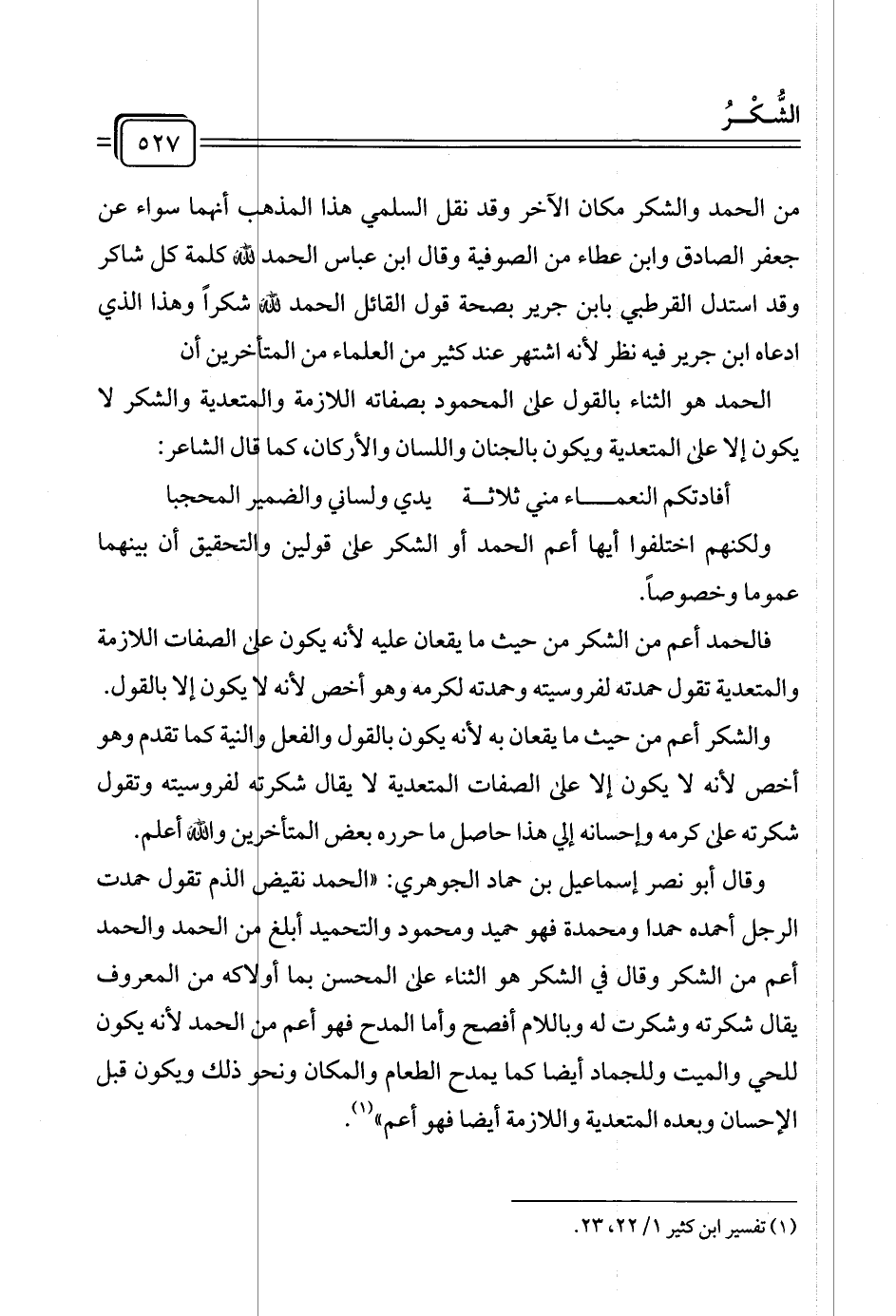 من الحمد والشكر مكان الآخر وقد نقل السلمي هذا المذهب أنهما سواء عن جعفر الصادق وابن عطاء من الصوفية وقال ابن عباس الحمد لله كلمة كل شاكر وقد استدل القرطبي بابن جرير بصحة قول القائل الحمد لله شكرًا وهذا الذي ادعاه ابن جرير فيه نظر لأنه اشتهر عند كثير من العلماء من المتأخرين أن الحمد هو الثناء بالقول على المحمود بصفاته اللازمة والمتعدية والشكر لا يكون إلا على المتعدية ويكون بالجنان واللسان والأركان، كما قال الشاعر: