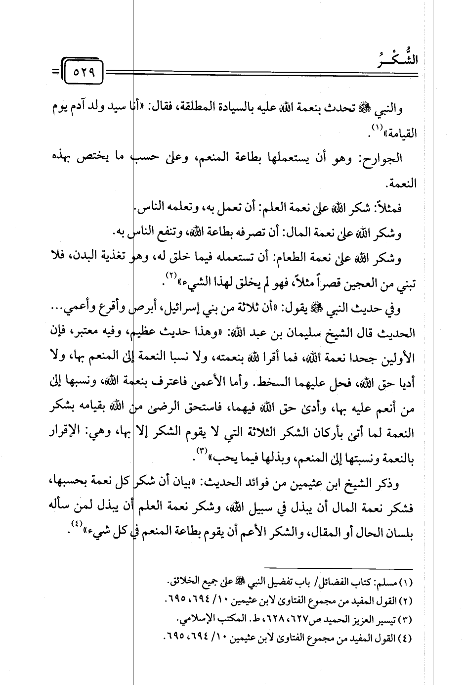 وفي حديث النبي - صلى الله عليه وسلم - يقول: "أن ثلاثة من بني إسرائيل، أبرص وأقرع وأعمى ... الحديث قال الشيخ سليمان بن عبد الله: "وهذا حديث عظيم، وفيه معتبر، فإن الأولين جحدا نعمة الله، فما أقرا لله بنعمته، ولا نسبا النعمة إلى المنعم بها، ولا أديا حق الله، فحل عليهما السخط. وأما الأعمى فاعترف بنعمة الله، ونسبها إلى من أنعم عليه بها، وأدى حق الله فيهما، فاستحق الرضى الله بقيامه بشكر النعمة لما أتى بأركان الشكر الثلاثة التي لا يقوم الشكر إلا بها، وهي: الإقرار بالنعمة ونسبتها إلى المنعم، وبذلها فيما يحب" (¬٣).