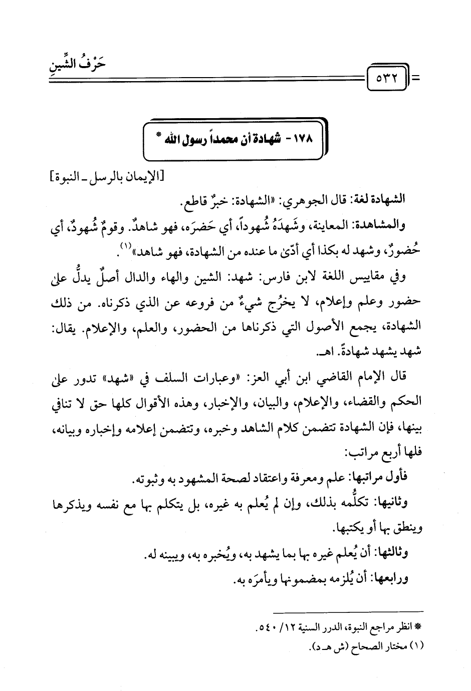 قال الإمام القاضي ابن أبي العز: "وعبارات السلف في "شهد" تدور على الحكم والقضاء، والإعلام، والبيان، والإخبار، وهذه الأقوال كلها حق لا تنافي بينها، فإن الشهادة تتضمن كلام الشاهد وخبره، وتتضمن إعلامه وإخباره وبيانه، فلها أربع مراتب: