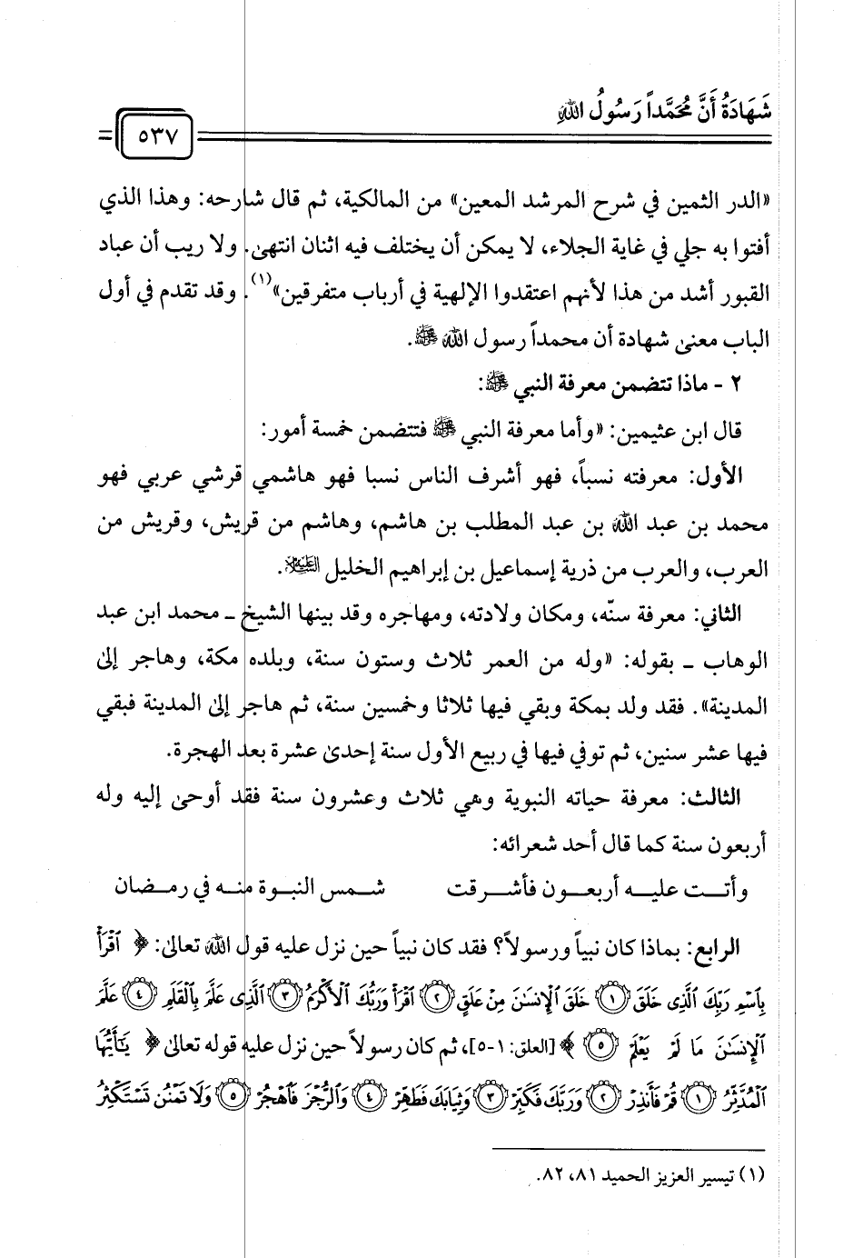 قال ابن عثيمين: "وأما معرفة النبي - صلى الله عليه وسلم - فتتضمن خمسة أمور: