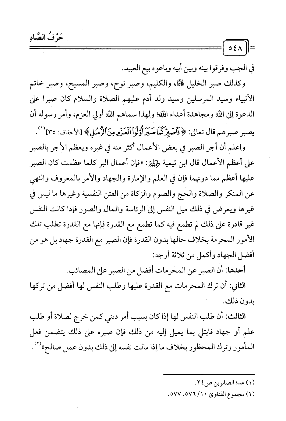 وكذلك صبر الخليل - رحمه الله -، والكليم، وصبر نوح، وصبر المسيح، وصبر خاتم الأنبياء وسيد المرسلين وسيد ولد آدم عليهم الصلاة والسلام كان صبرا على الدعوة إلى الله ومجاهدة أعداء الله؛ ولهذا سماهم الله أولي العزم، وأمر رسوله أن يصبر صبرهم قال تعالى: {فَاصْبِرْ كَمَا صَبَرَ أُولُو الْعَزْمِ مِنَ الرُّسُلِ} [الأحقاف: ٣٥] (¬١).