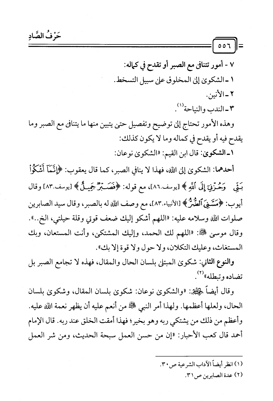 أحدهما: الشكوى إلى الله، فهذا لا ينافي الصبر، كما قال يعقوب: {إِنَّمَا أَشْكُو بَثِّي وَحُزْنِي إِلَى اللَّهِ} [يوسف: ٨٦]، مع قوله: {فَصَبْرٌ جَمِيلٌ} [يوسف: ٨٣]، وقال أيوب: {مَسَّنِيَ الضُّرُّ} [الأنبياء: ٨٣] مع وصف الله له بالصبر، وقال سيد الصابرين صلوات الله وسلامه عليه: "اللهم أشكو إليك ضعف قوتي وقلة حيلتي، الخ .. ". وقال موسى - صلى الله عليه وسلم -: "اللهم لك الحمد، وإليك المشتكى، وأنت المستعان، وبك المستغاث، وعليك التكلان، ولا حول ولا قوة إلا بك".
