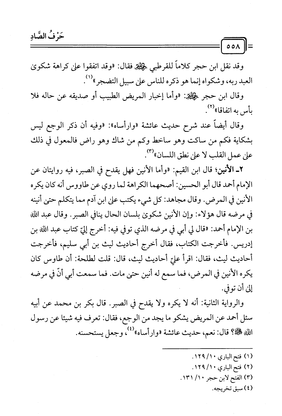 ٢ - الأنين؛ قال ابن القيم: "وأما الأنين فهل يقدح في الصبر، فيه روايتان عن الإمام أحمد قال أبو الحسين: أصحهما الكراهة لما روي عن طاووس أنه كان يكره الأنين في المرض. وقال مجاهد: كل شيء يكتب على ابن آدم مما يتكلم حتى أنينه في مرضه قال هؤلاء: وإن الأنين شكوى بلسان الحال ينافي الصبر. وقال عبد الله بن الإمام أحمد: "قال لي أبي في مرضه الذي توفي فيه: أخرج إليّ كتاب عبد الله بن إدريس. فأخرجت الكتاب، فقال أخرج أحاديث ليث بن أبي سليم، فأخرجت أحاديث ليث، فقال: اقرأ عليّ أحاديث ليث، قال: قلت لطلحة: أن طاوس كان يكره الأنين في المرض، فما سمع له أنين حتى مات. فما سمعت أبي أنّ في مرضه إلى أن توفي.