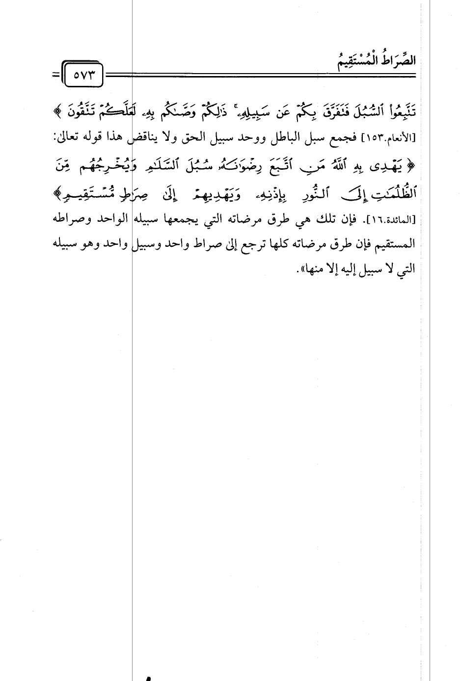 تَتَّبِعُوا السُّبُلَ فَتَفَرَّقَ بِكُمْ عَنْ سَبِيلِهِ ذَلِكُمْ وَصَّاكُمْ بِهِ لَعَلَّكُمْ تَتَّقُونَ (١٥٣)} [الأنعام: ١٥٣] فجمع سبل الباطل ووحد سبيل الحق ولا يناقض هذا قوله تعالى: {يَهْدِي بِهِ اللَّهُ مَنِ اتَّبَعَ رِضْوَانَهُ سُبُلَ السَّلَامِ وَيُخْرِجُهُمْ مِنَ الظُّلُمَاتِ إِلَى النُّورِ بِإِذْنِهِ وَيَهْدِيهِمْ إِلَى صِرَاطٍ مُسْتَقِيمٍ (١٦)} [المائدة: ١٦]. فإن تلك هي طرق مرضاته التي يجمعها سبيله الواحد وصراطه المستقيم فإن طرق مرضاته كلها ترجع إلى صراط واحد وسبيل واحد وهو سبيله التي لا سبيل إليه إلا منها".