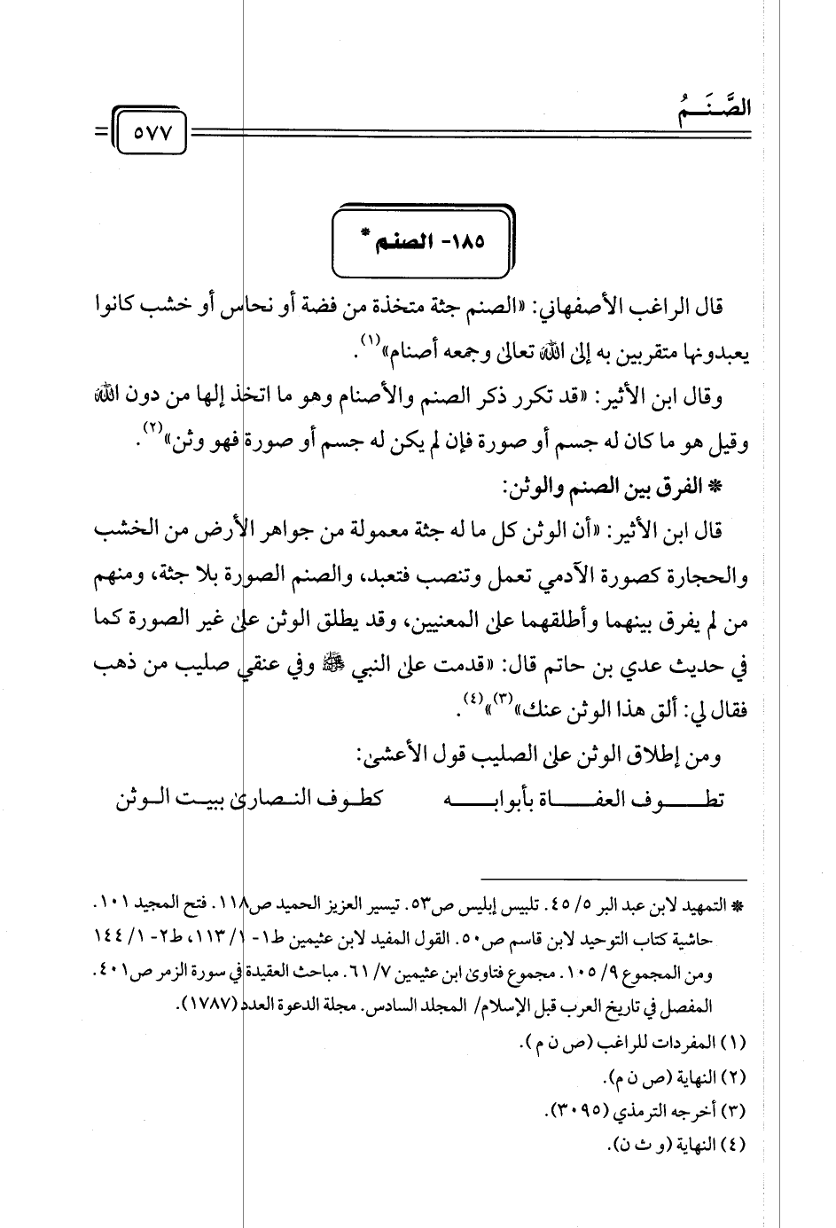 وقال ابن الأثير: "قد تكرر ذكر الصنم والأصنام وهو ما اتخذ إلها من دون الله وقيل هو ما كان له جسم أو صورة فإن لم يكن له جسم أو صورة فهو وثن" (¬٢).