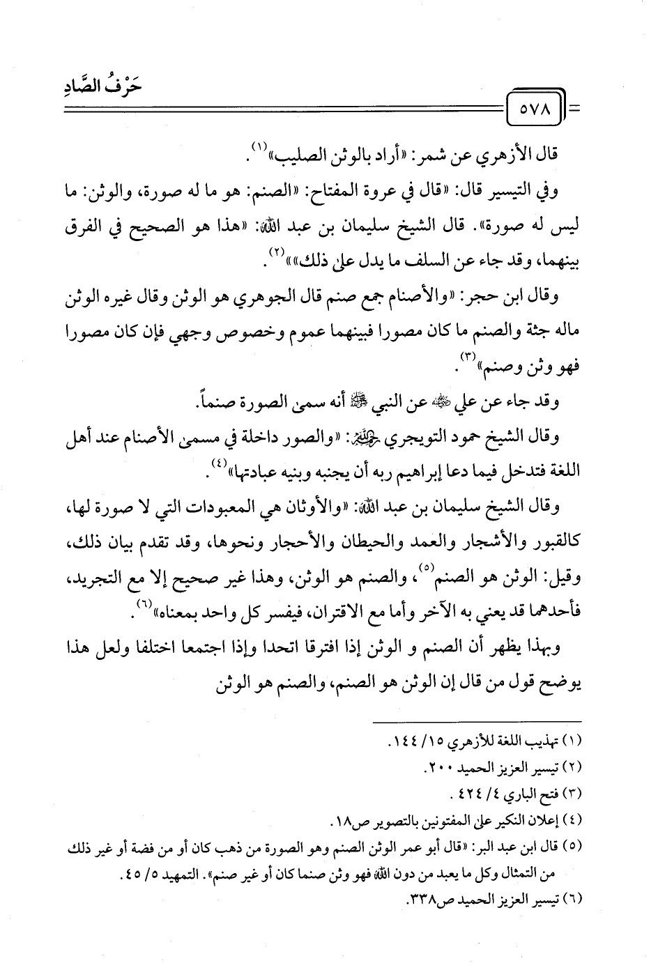 (¬٥) قال ابن عبد البر: "قال أبو عمر الوثن الصنم وهو الصورة من ذهب كان أو من فضة أو غير ذلك من التمثال وكل ما يعبد من دون الله فهو وثن صنما كان أو غير صنم". التمهيد ٥/ ٤٥.