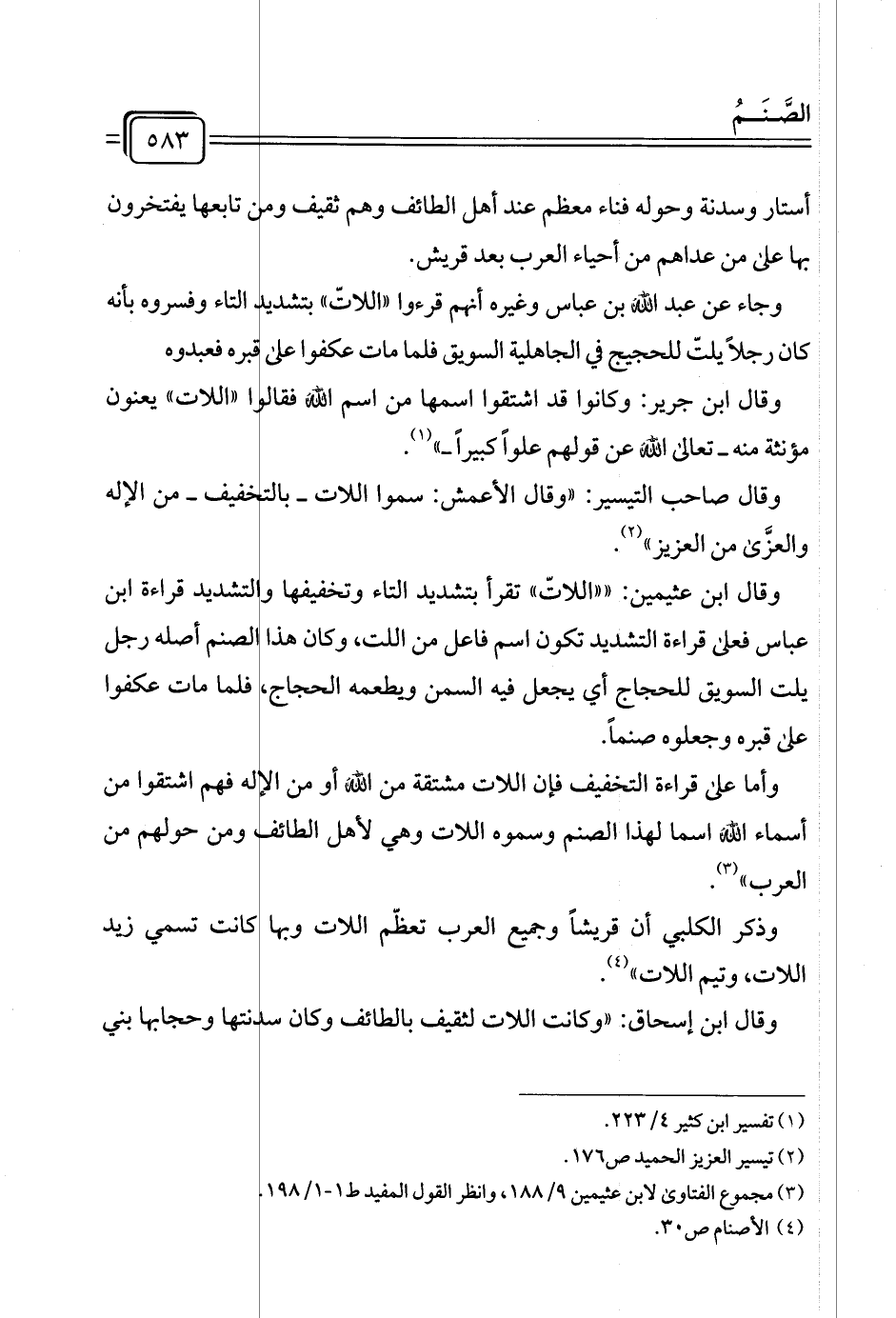 وقال ابن عثيمين: "اللاتّ" تقرأ بتشديد التاء وتخفيفها والتشديد قراءة ابن عباس فعى قراءة التشديد تكون اسم فاعل من اللت، وكان هذا الصنم أصله رجل يلت السويق للحجاج أي يجعل فيه السمن ويطعمه الحجاج، فلما مات عكفوا على قبره وجعلوه صنمًا.