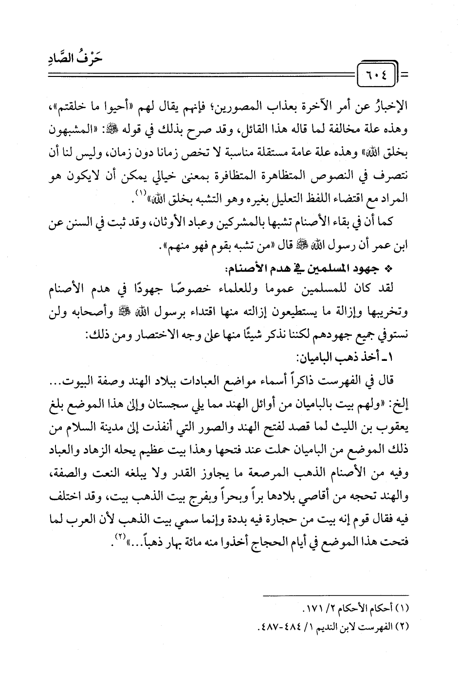 كما أن في بقاء الأصنام تشبها بالمشركين وعباد الأوثان، وقد ثبت في السنن عن ابن عمر أن رسول الله - صلى الله عليه وسلم - قال "من تشبه بقوم فهو منهم".