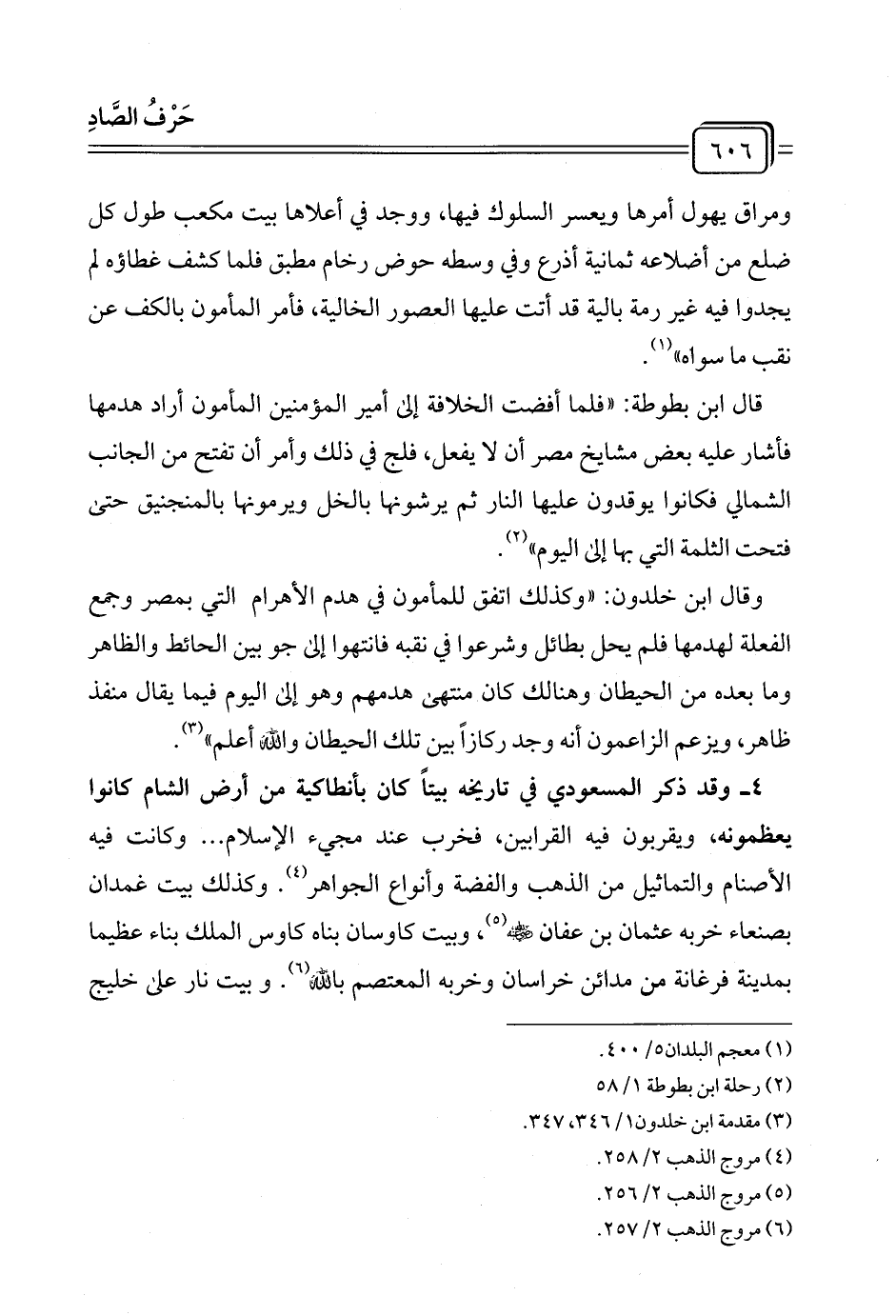 وقال ابن خلدون: "وكذلك اتفق للمأمون في هدم الأهرام التي بمصر وجمع الفعلة لهدمها فلم يحل بطائل وشرعوا في نقبه فانتهوا إلى جو بين الحائط والظاهر وما بعده من الحيطان وهنالك كان منتهى هدمهم وهو إلى اليوم فيما يقال منفذ ظاهر، ويزعم الزاعمون أنه وجد ركازًا بين تلك الحيطان والله أعلم" (¬٣).